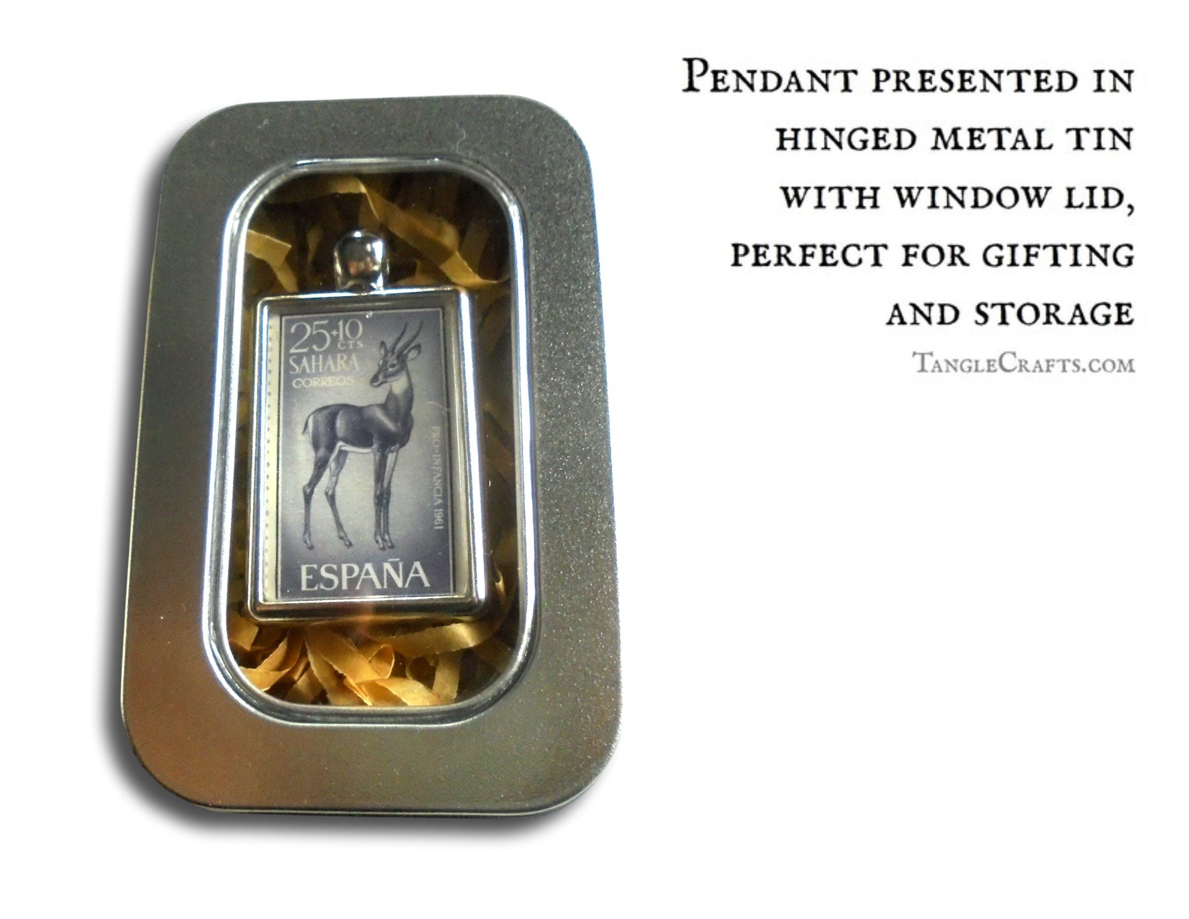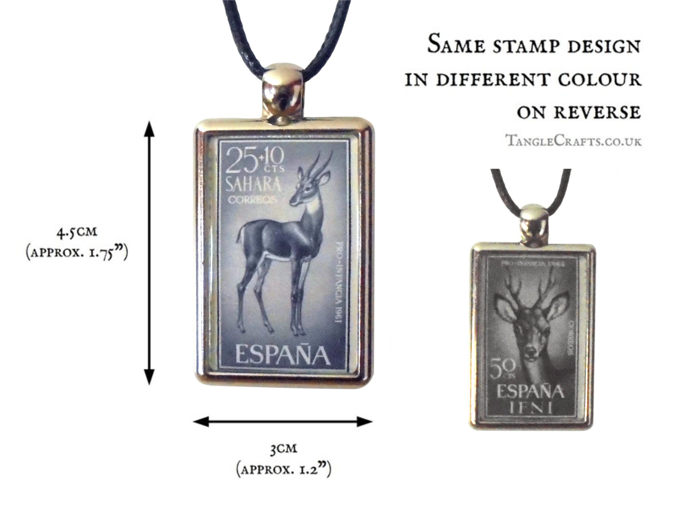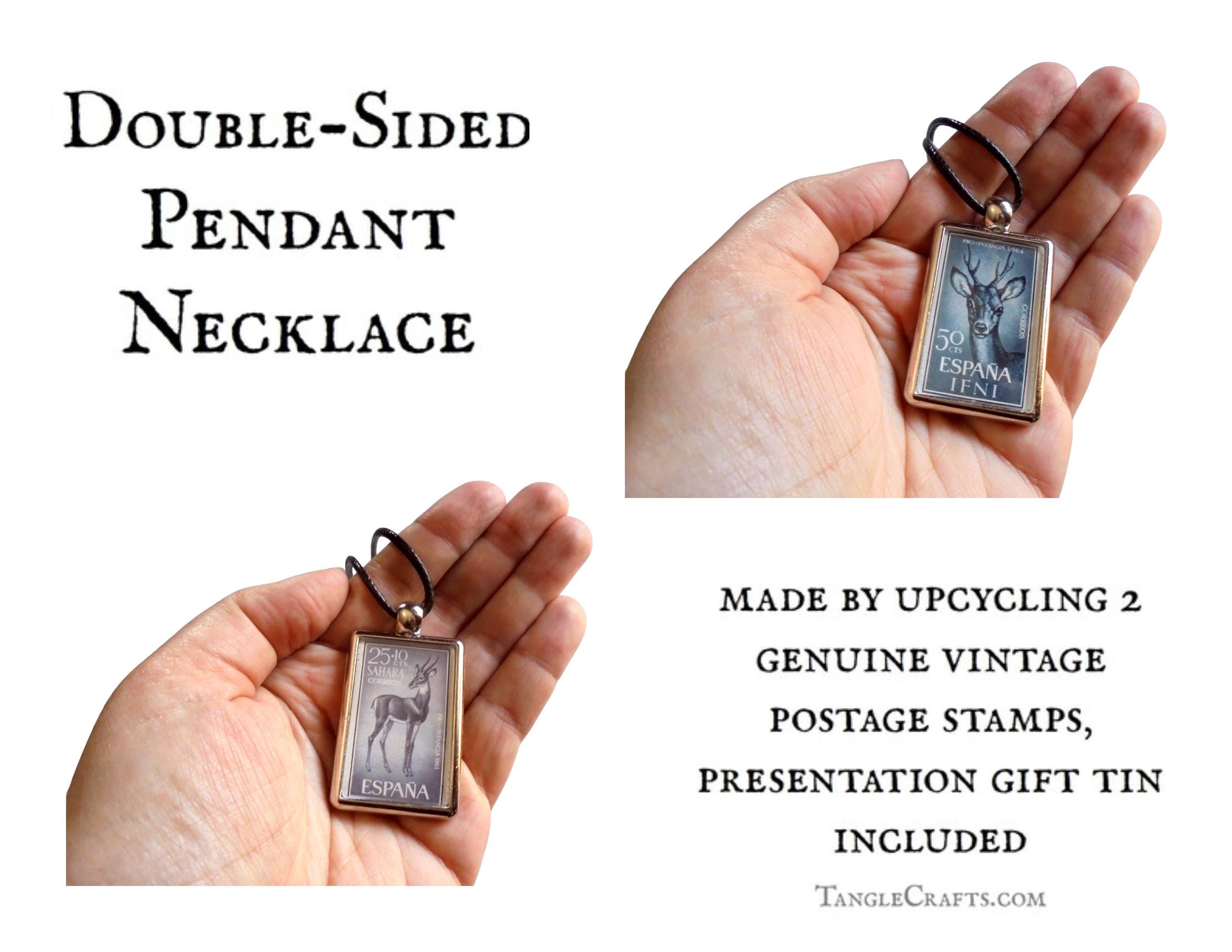 This quirky reversible deer/gazelle pendant necklace is made by upcycling 2 real vintage postage stamps into a sturdy silvertone metal casing. Featuring the 2 different stamp designs in different shades of grey, you can flip the pendant to suit your mood or to match your outfit for twice as much history, character and charm! This unique piece of statement jewellery is a perfect gift for the postally inclined wildlife lover, stamp collector, letter writer etc. Please read on for full details: