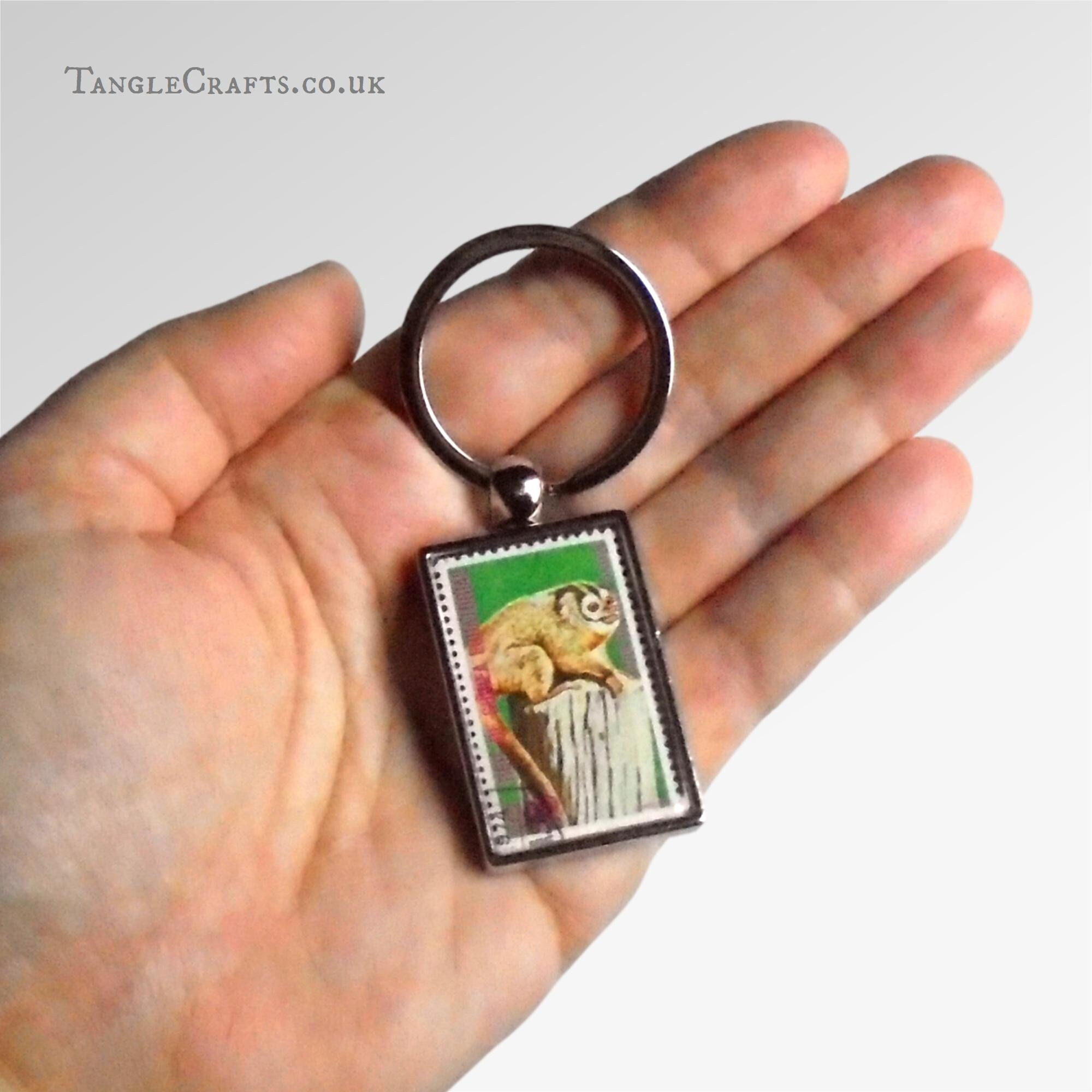 This cute wide-eyed monkey keyring is made by upcycling a real vintage postage stamp from the seventies. Encapsulating a genuine fragment of postal history, it is a quirky little gift for any primate loving stamp collector, letter writer, or nostalgic traveller. Please read on for full details: