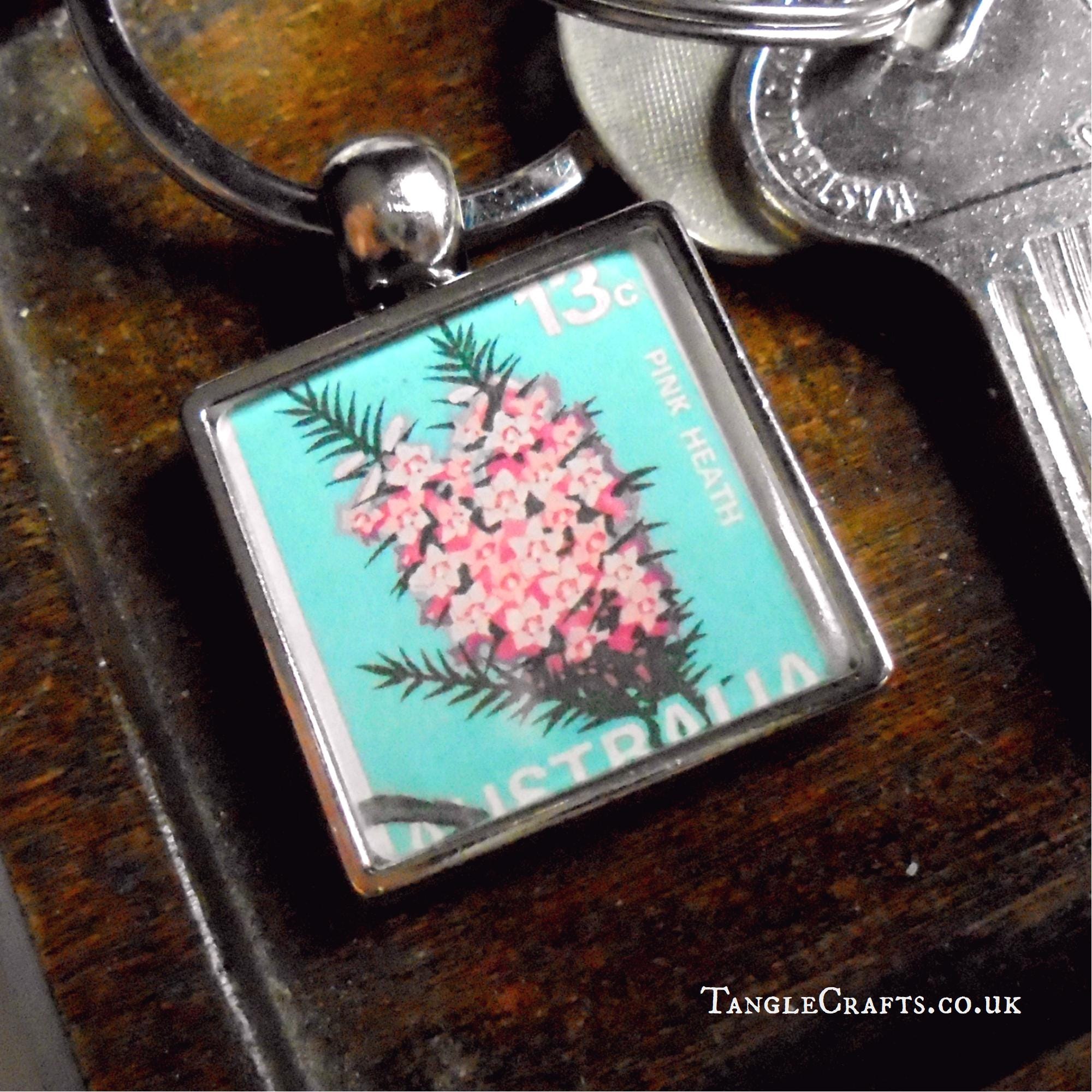 This pretty floral keyring has been made by upcycling a real postage stamp from the 1960s. Encapsulating a genuine piece of Australian postal history, this is a fun & colourful accessory for any flower loving stamp collector, letter writer or nostalgic traveller! Please read on for full details: