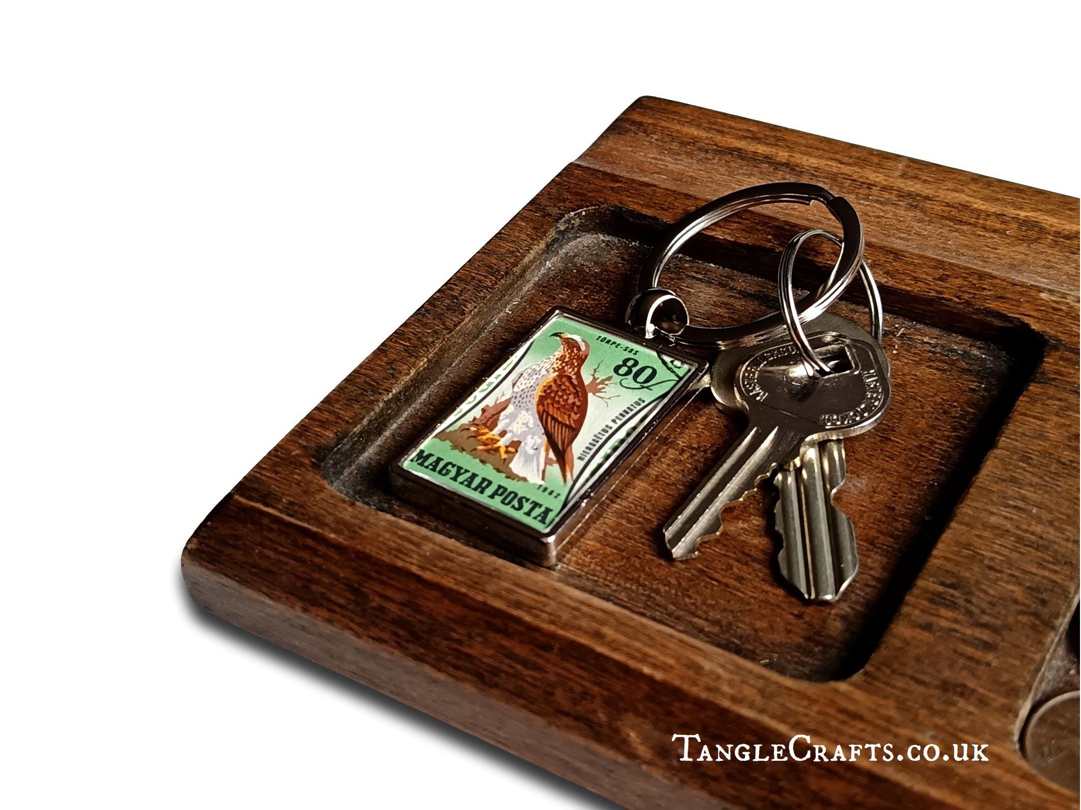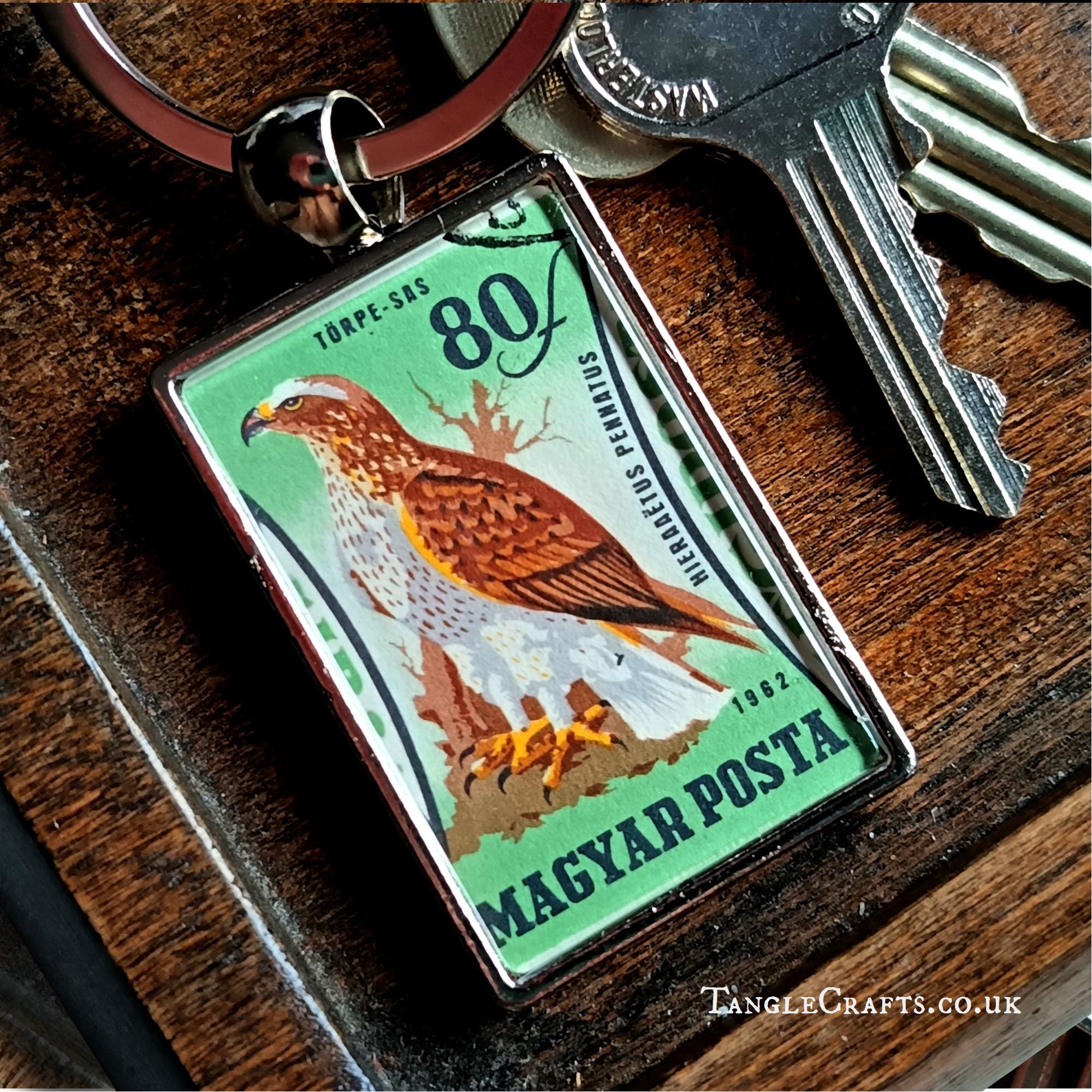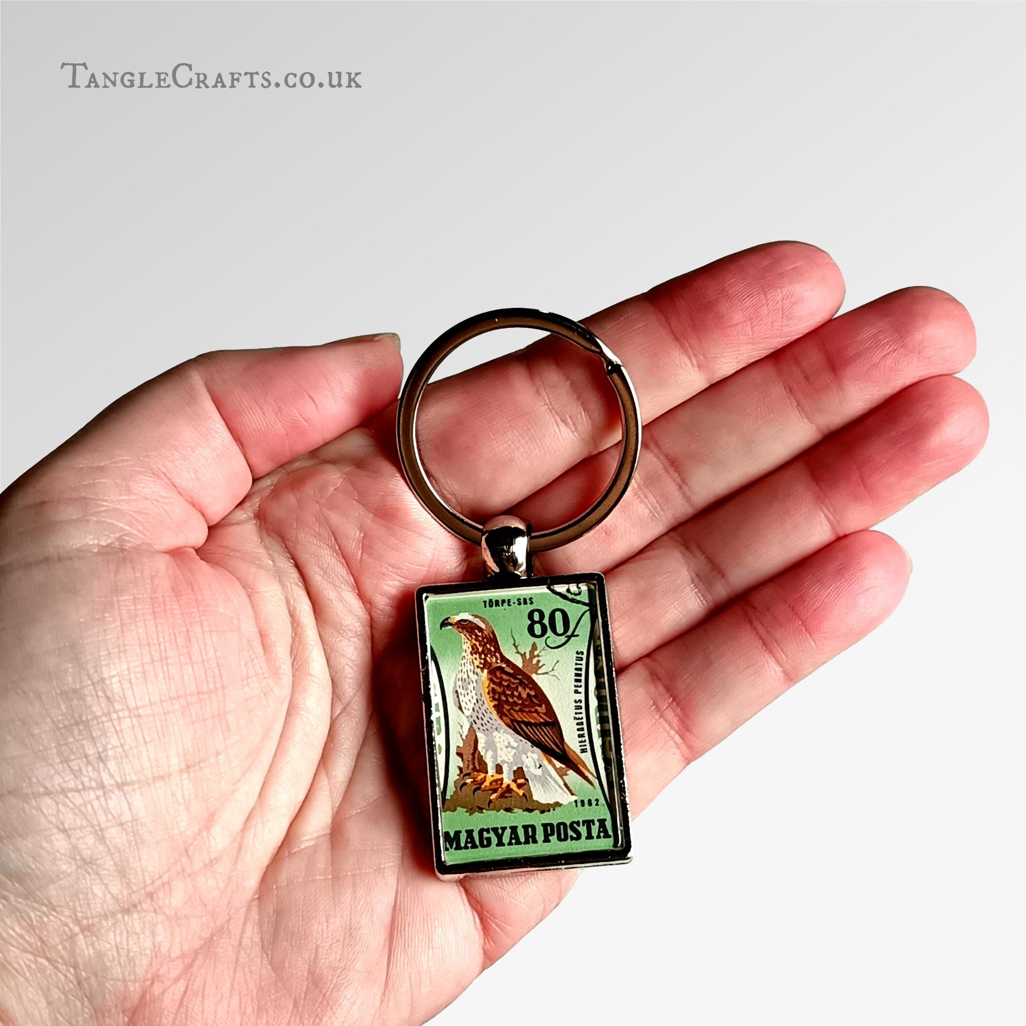 This charming eagle keyring is made with a real vintage postage stamp from Hungary - a great gift for any bird enthusiast, stamp collector, letter writer, or nostalgic traveller. The silver metal keyring encapsulates a genuine fragment of Hungarian postal history in a quirky yet functional combination. Please read on for full details: