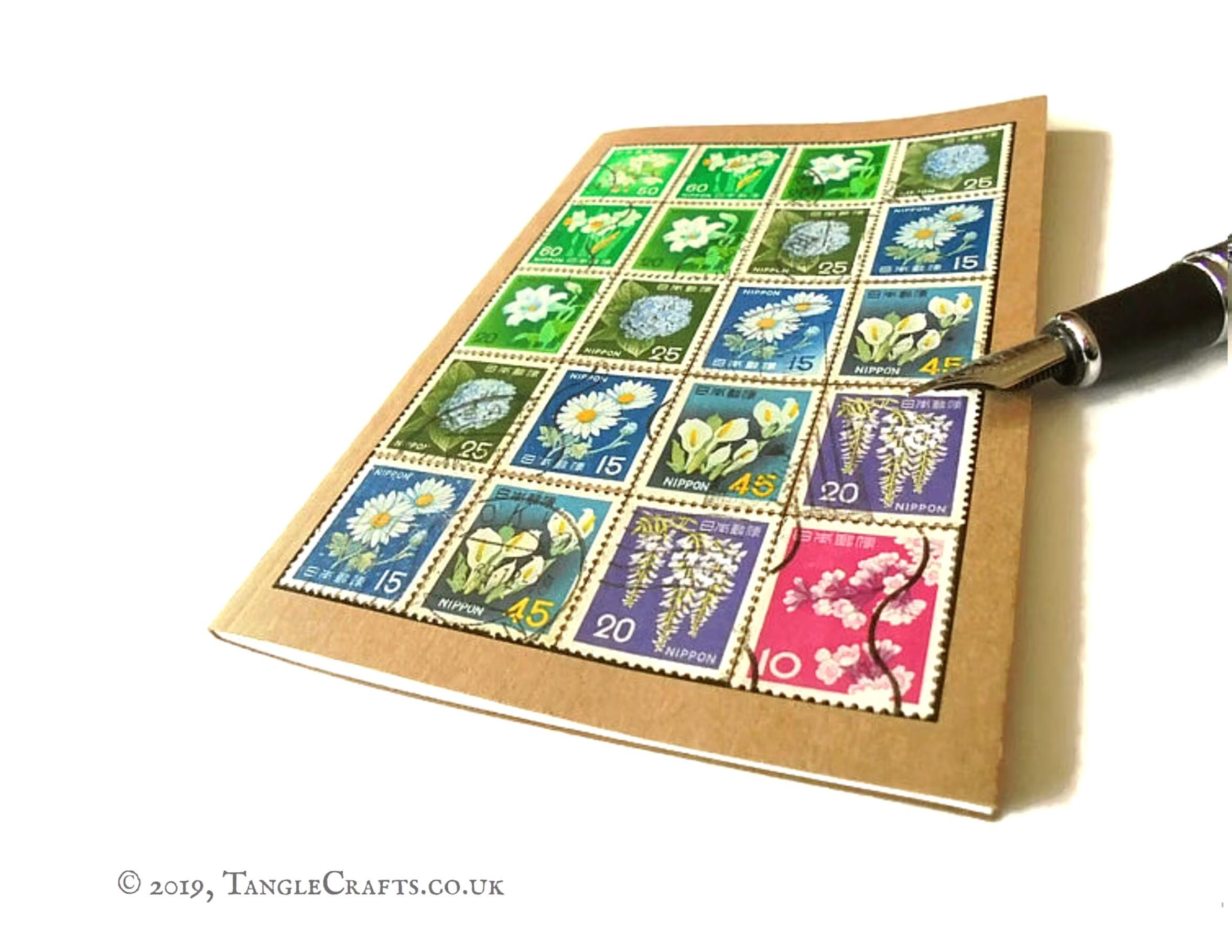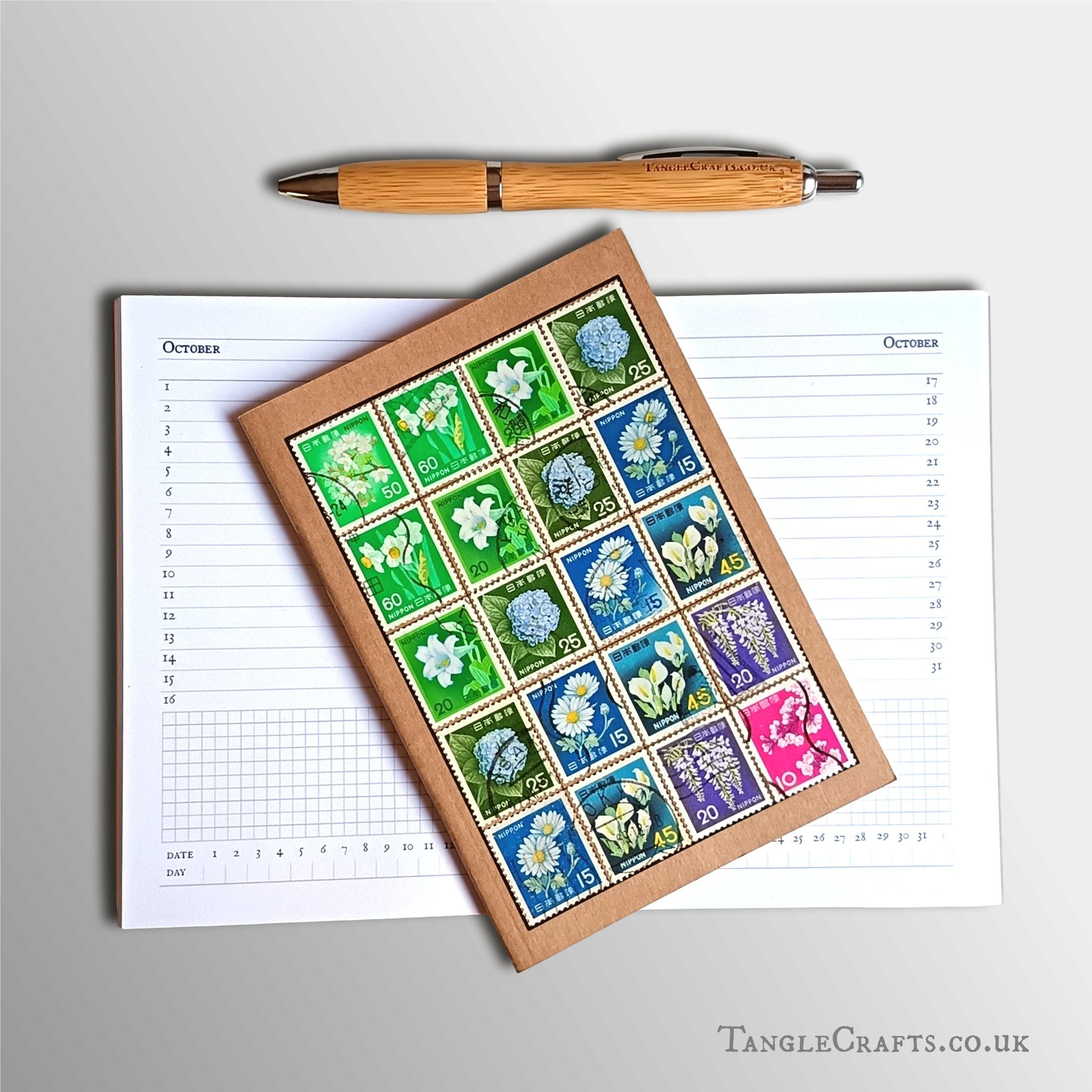 This unique Japanese floral diary is decorated with genuine vintage postage stamps to make the perfect gift for any garden lover. The undated format means you can put it to use in any year, but an optional 2026 label set is also available. With real stamps on the cover & recycled paper pages inside, this ecofriendly pocket-sized diary is absolutely one of a kind. Please read on for more details:
