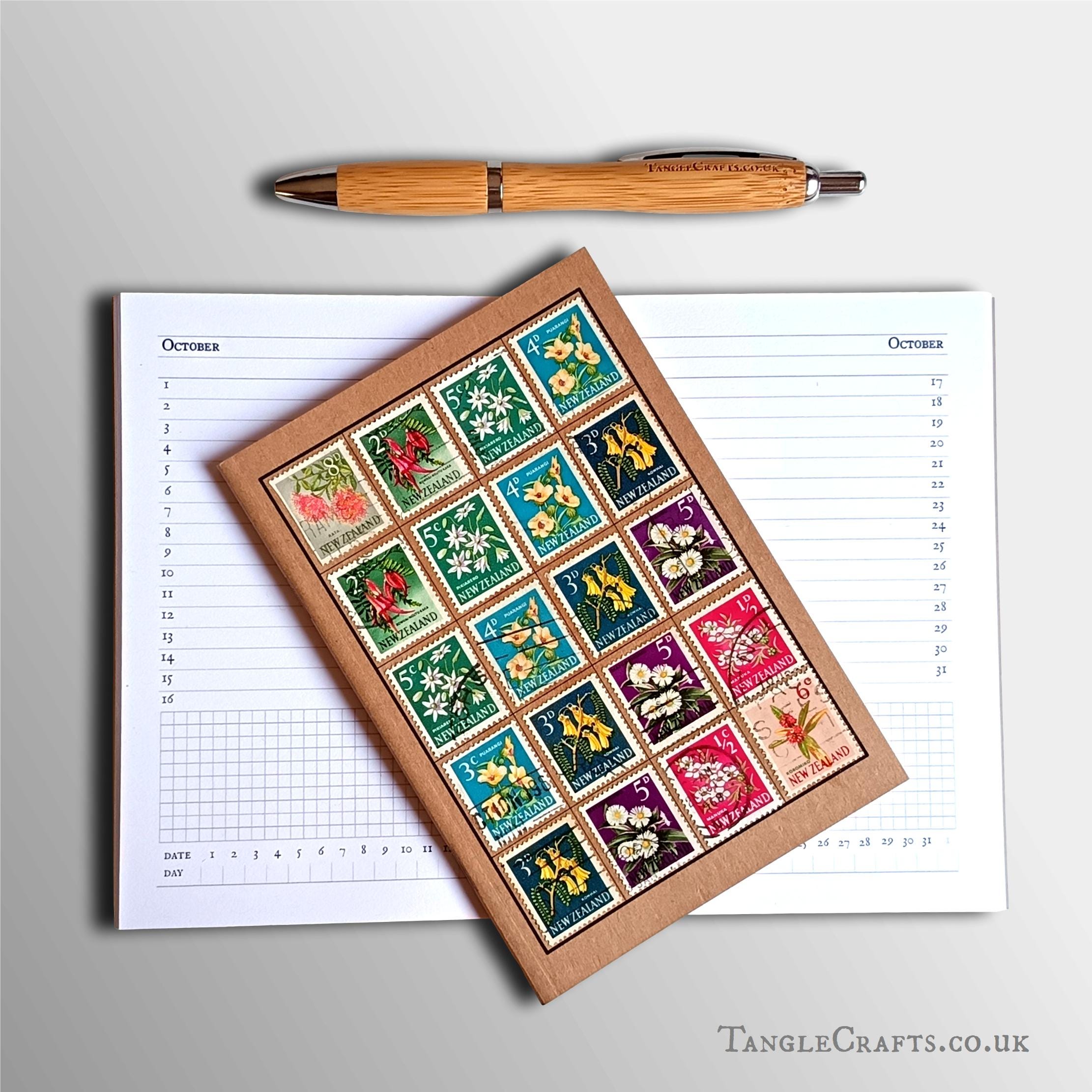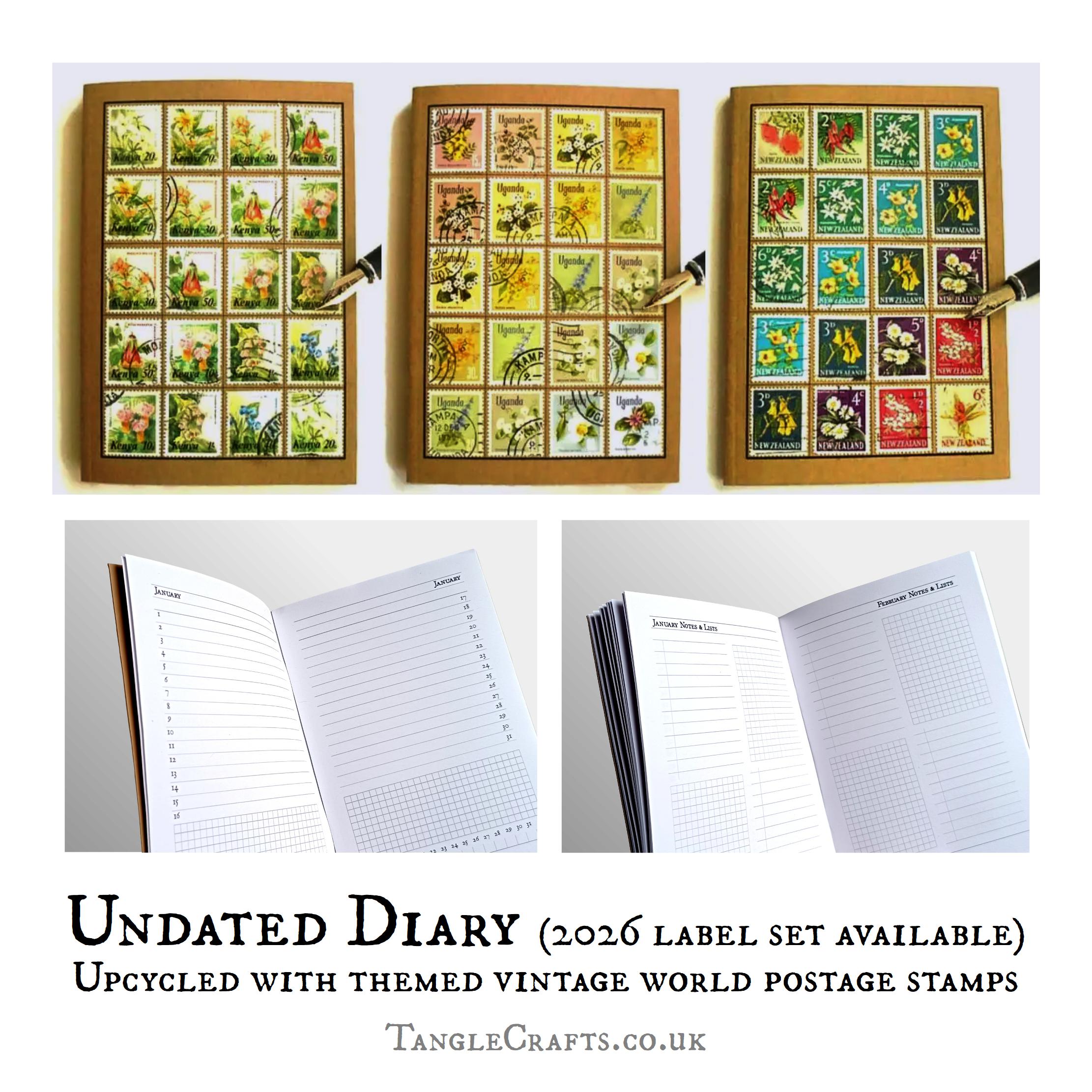 Brighten up every day with a unique floral diary decorated with genuine vintage postage stamps - the perfect gift for any garden lover. The undated format means you can put it to use in any year, but an optional 2026 label set is also available. Also great as a planting record or birthday book! With real postage stamps on the cover & recycled paper pages inside, this ecofriendly pocket-sized diary is absolutely one of a kind. Please read on for more details: