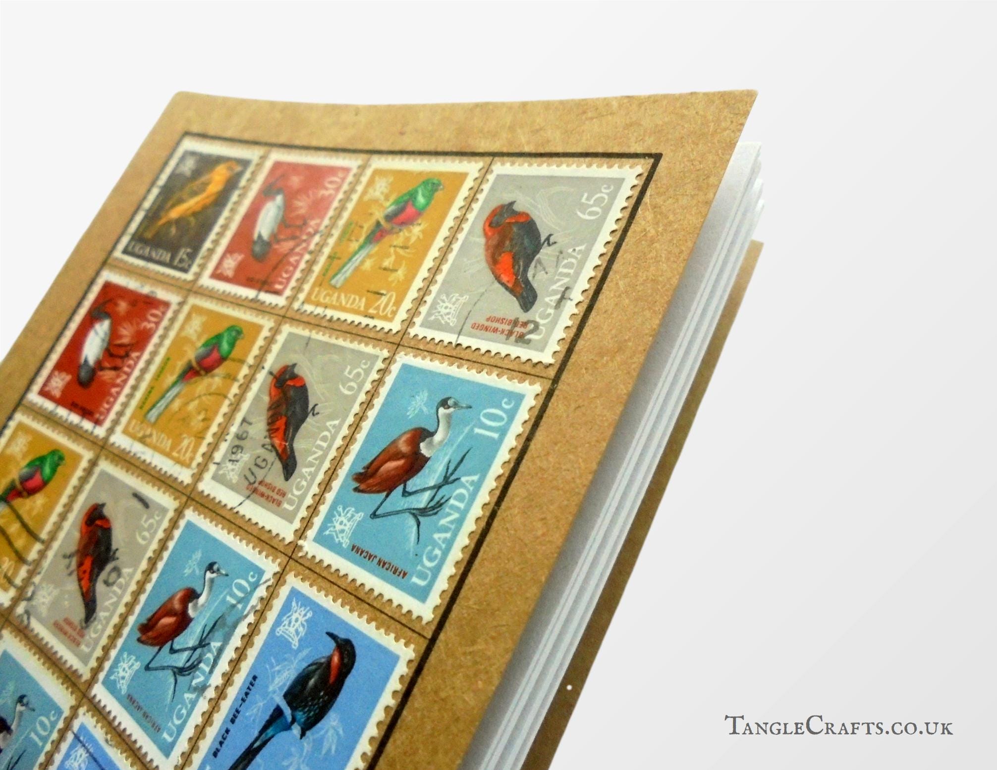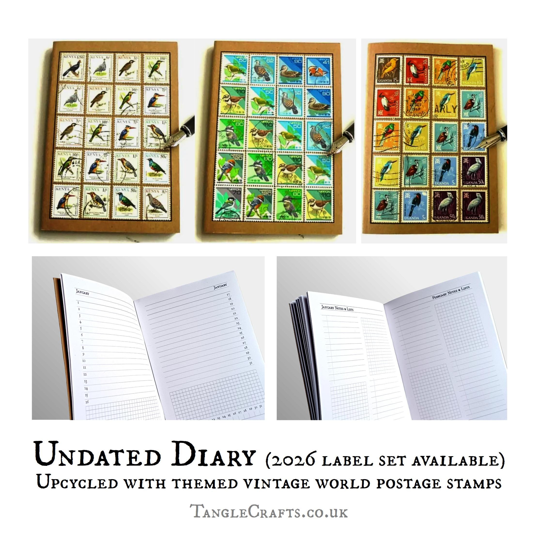 Fly into the New Year with a unique diary decorated with genuine vintage postage stamps is the perfect gift for any bird lover (choose your favourite stamp mix from those shown/listed). The undated format means you can put your diary to use in any year, but an optional 2026 label set is also available. Also great as a bird-spotter's log book, or hand birthday book! With real postage stamps on the cover & recycled paper pages inside, this ecofriendly pocket-sized diary is absolutely one of a kind. Please read on for more details: