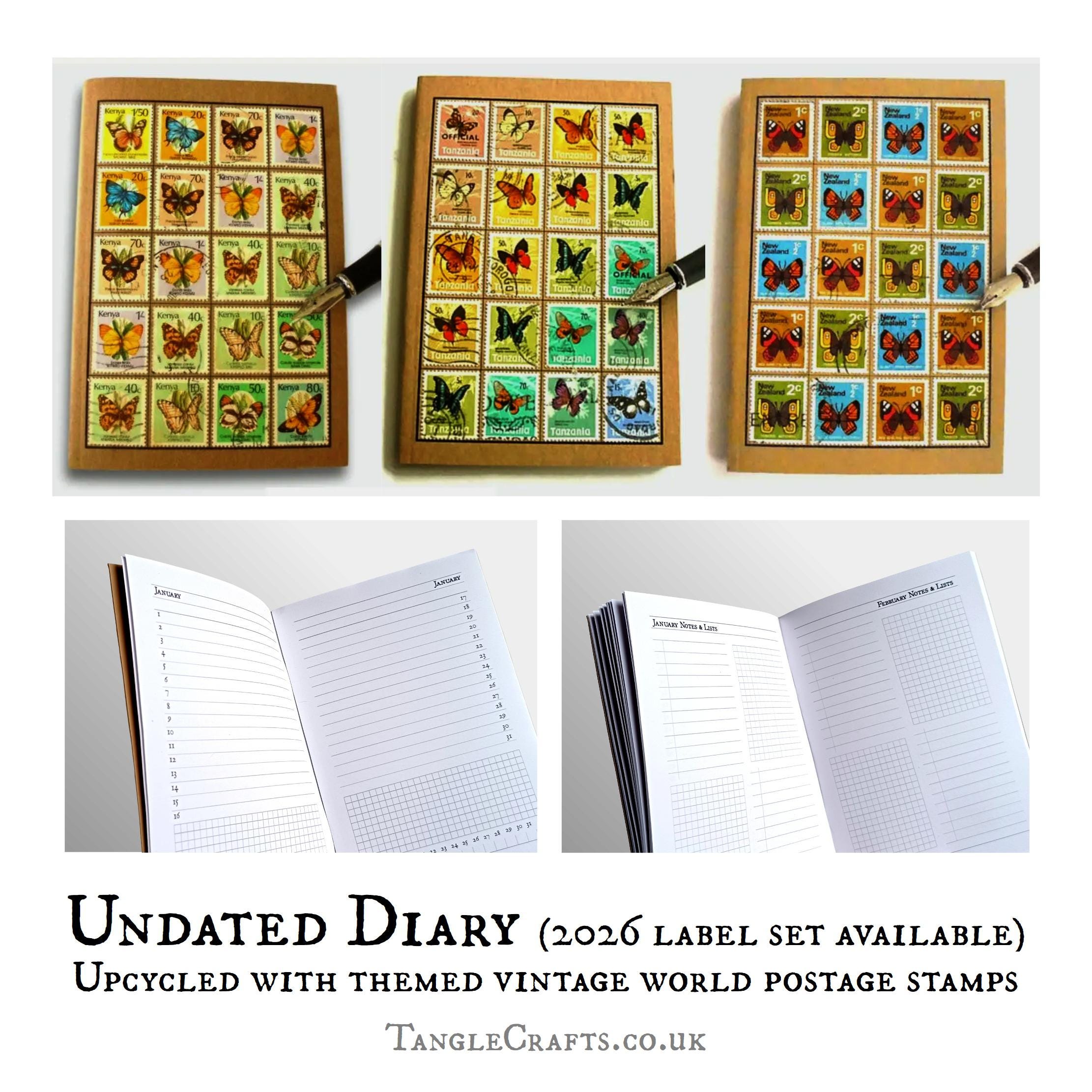 Flutter into the New Year with a unique butterfly diary decorated with genuine vintage postage stamps - the perfect gift for any nature lover (choose your favourite from 3 themes). The undated format means you can put it to use in any year, but an optional 2026 label set is also available. Also great as a pocket nature journal/log book. With real postage stamps on the cover & recycled paper pages inside, this ecofriendly diary is absolutely one of a kind. Please read on for more details: