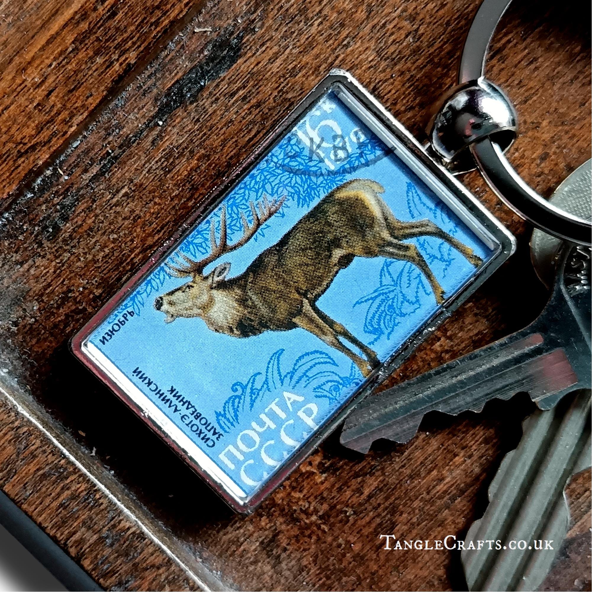 This lovely red deer keyring is made by upcycling a real vintage postage stamp from 1970. The sturdy keychain encapsulates a genuine fragment of Russian postal history - a fun gift for any wildlife loving stamp collector, letter writer, or nostalgic traveller... Please read on for full details: