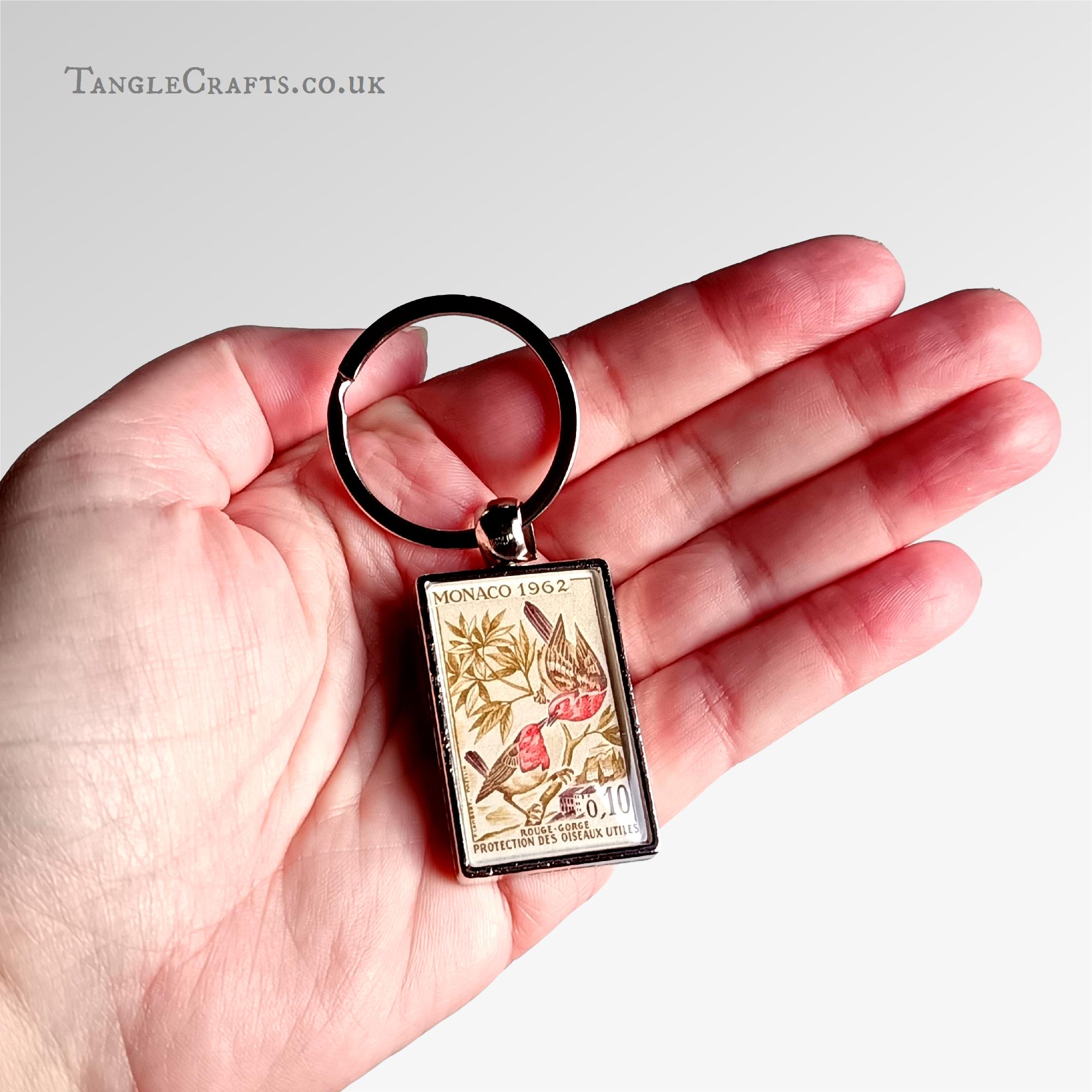 This charming robin keyring encapsulates a genuine vintage postage stamp from the 1960s - a little fragment of postal history, just for you! A fun gift for any stamp collector, letter writer, nostalgic traveller or bird lover... Please read on for full details: