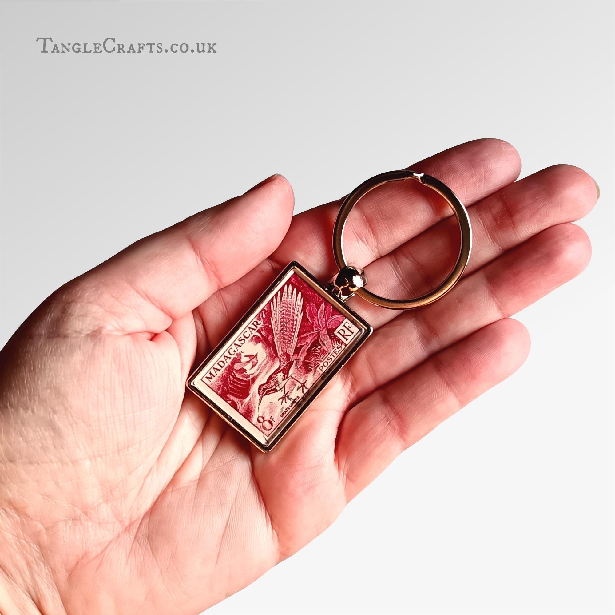 • A real used vintage stamp is captured in the keyring casing, issued in Madagascar circa 1954