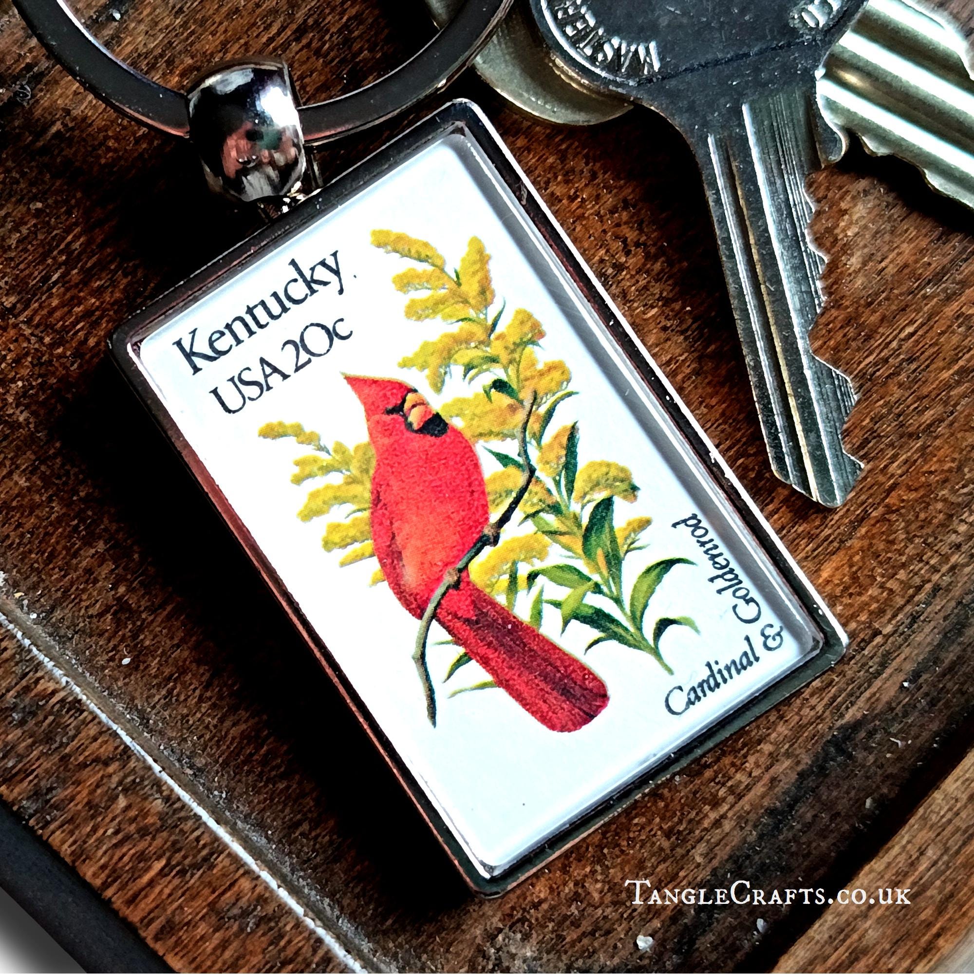 Celebrate your favourite US states! Choose from the birds & flowers of 50 states, as depicted on this series of 1982 postage stamps. Each keychain is made by upcycling a genuine stamp, and encapsulates a genuine fragment of US postal history, just for you! A fun gift for any nature loving stamp collector, philatelist, letter writer, or traveller... Please read on for full details: