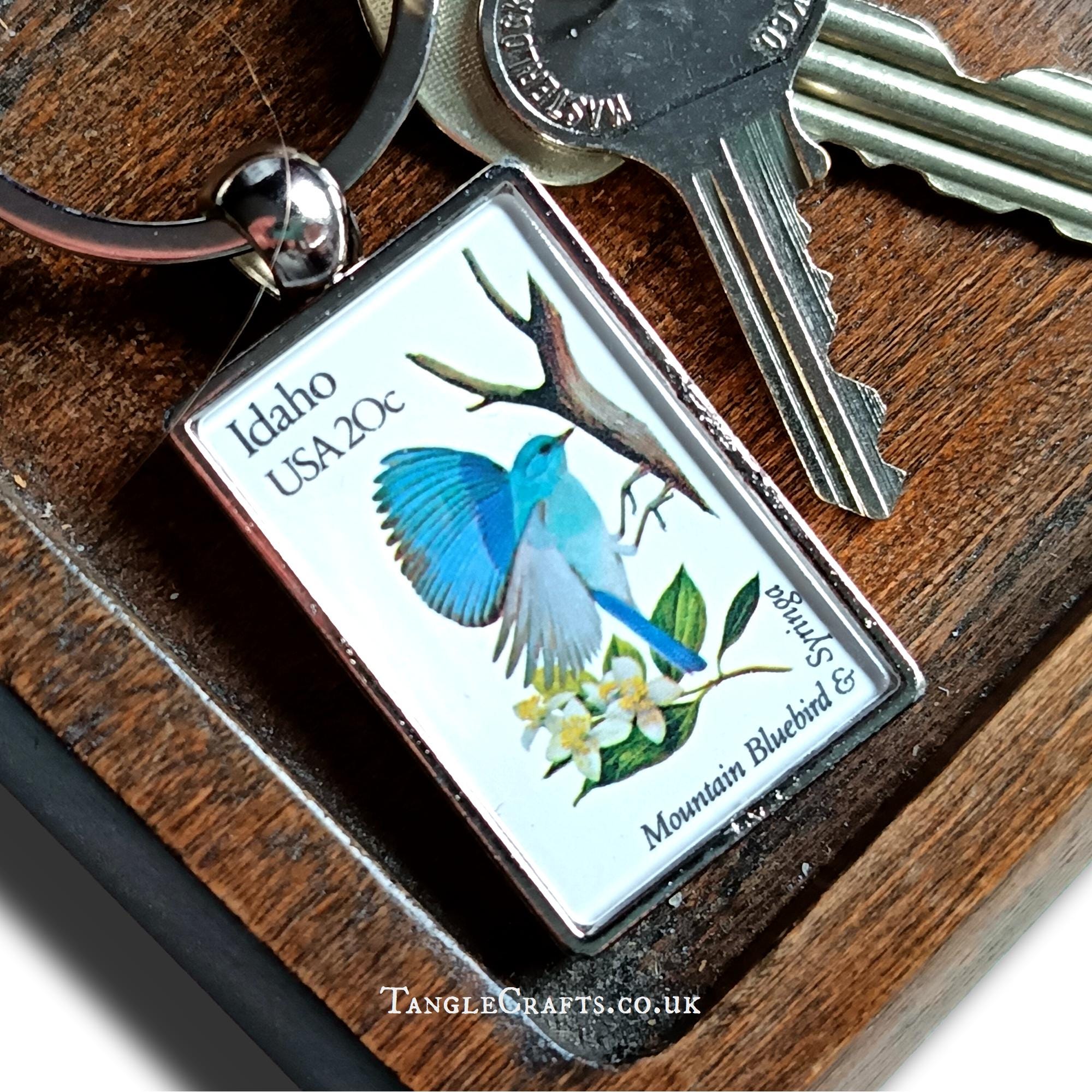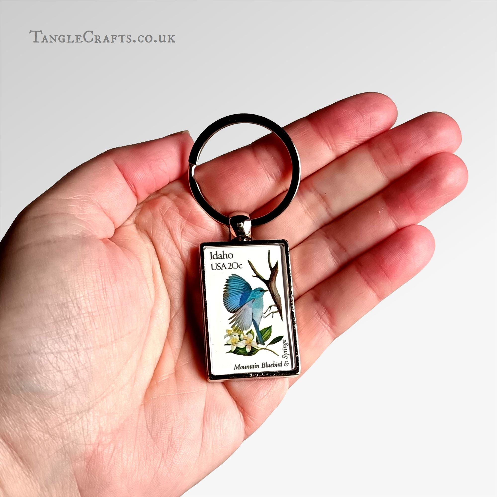 Celebrate the nature of Idaho state! Featuring a syringa flower & mountain bluebird, this keychain is made by upcycling a vintage 1980s postage stamp, encapsulating a genuine fragment of US postal history, just for you! A fun gift for any stamp collector, philatelist, letter writer, or bird/flower lover... Please read on for full details: