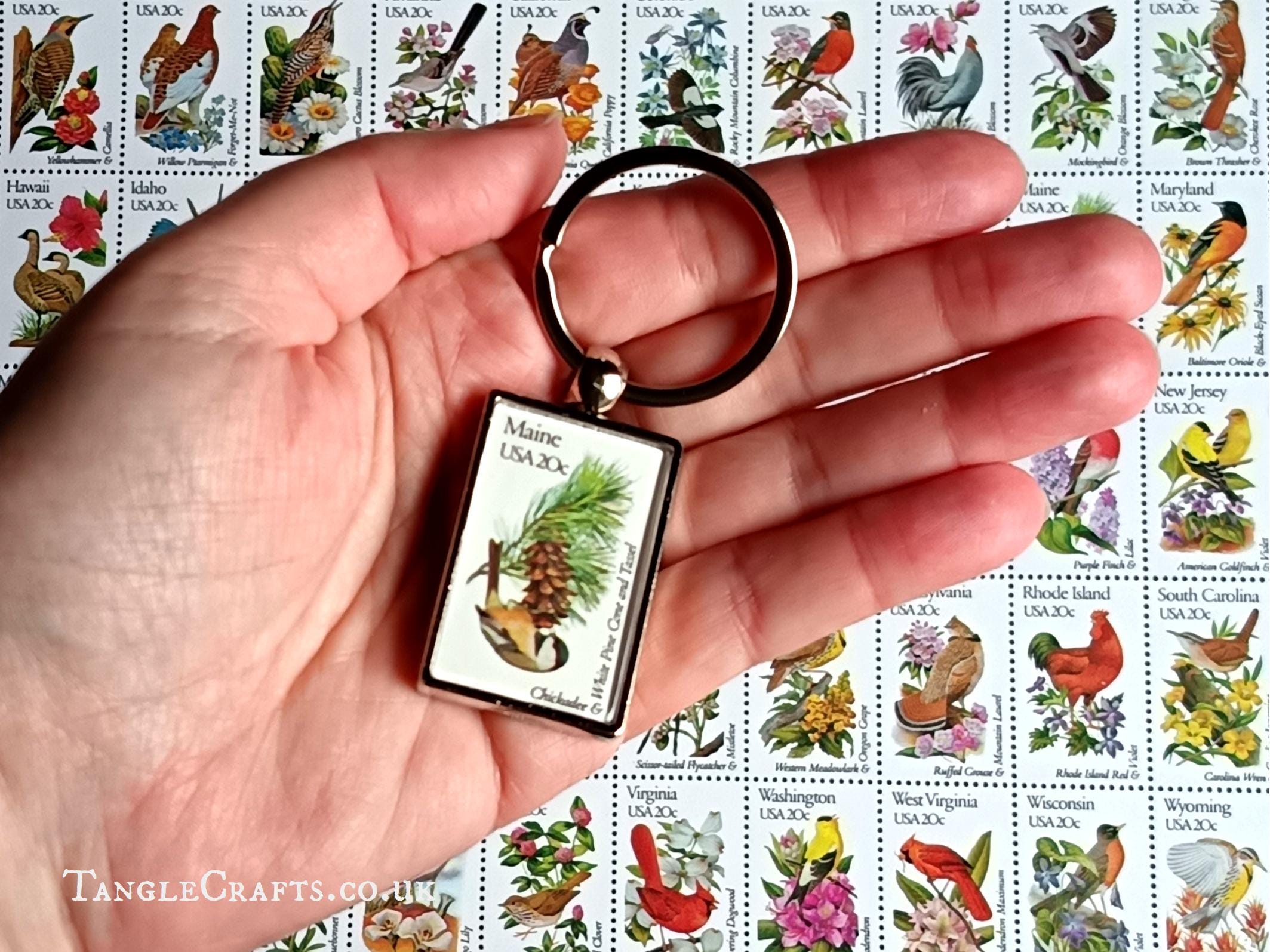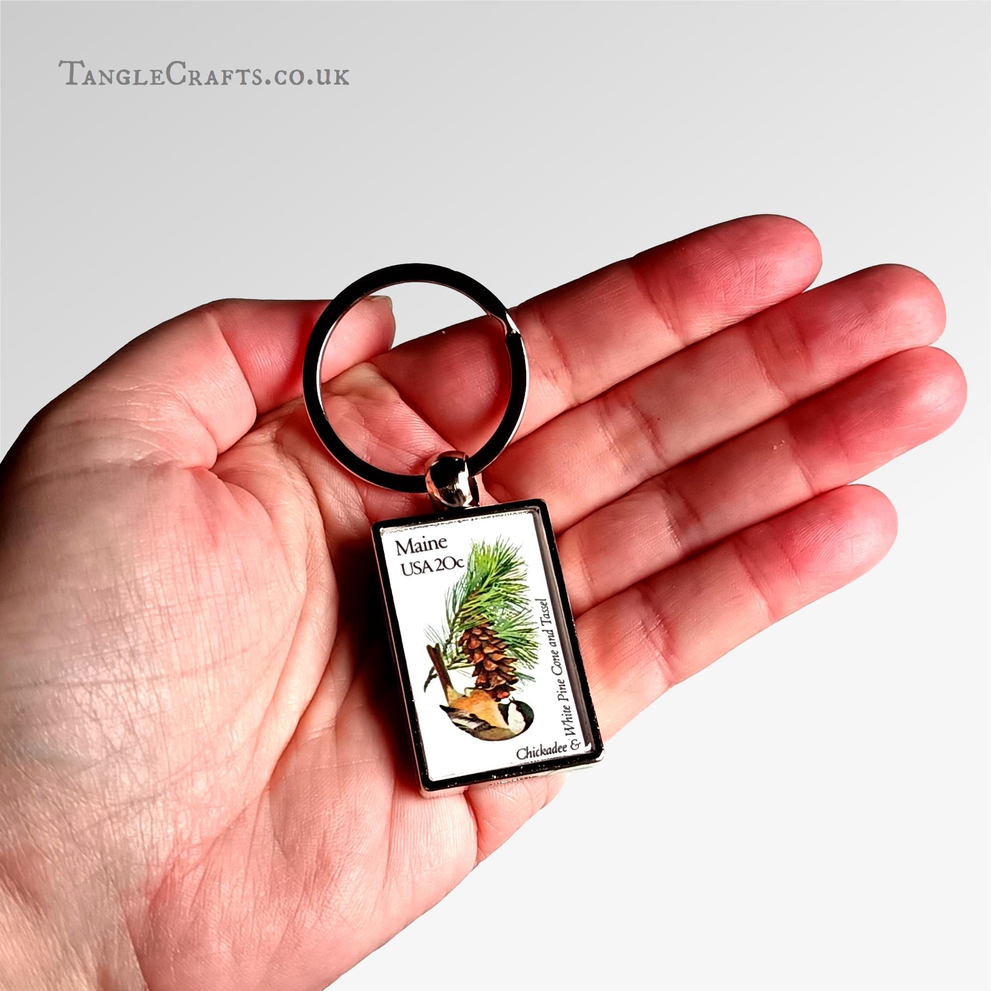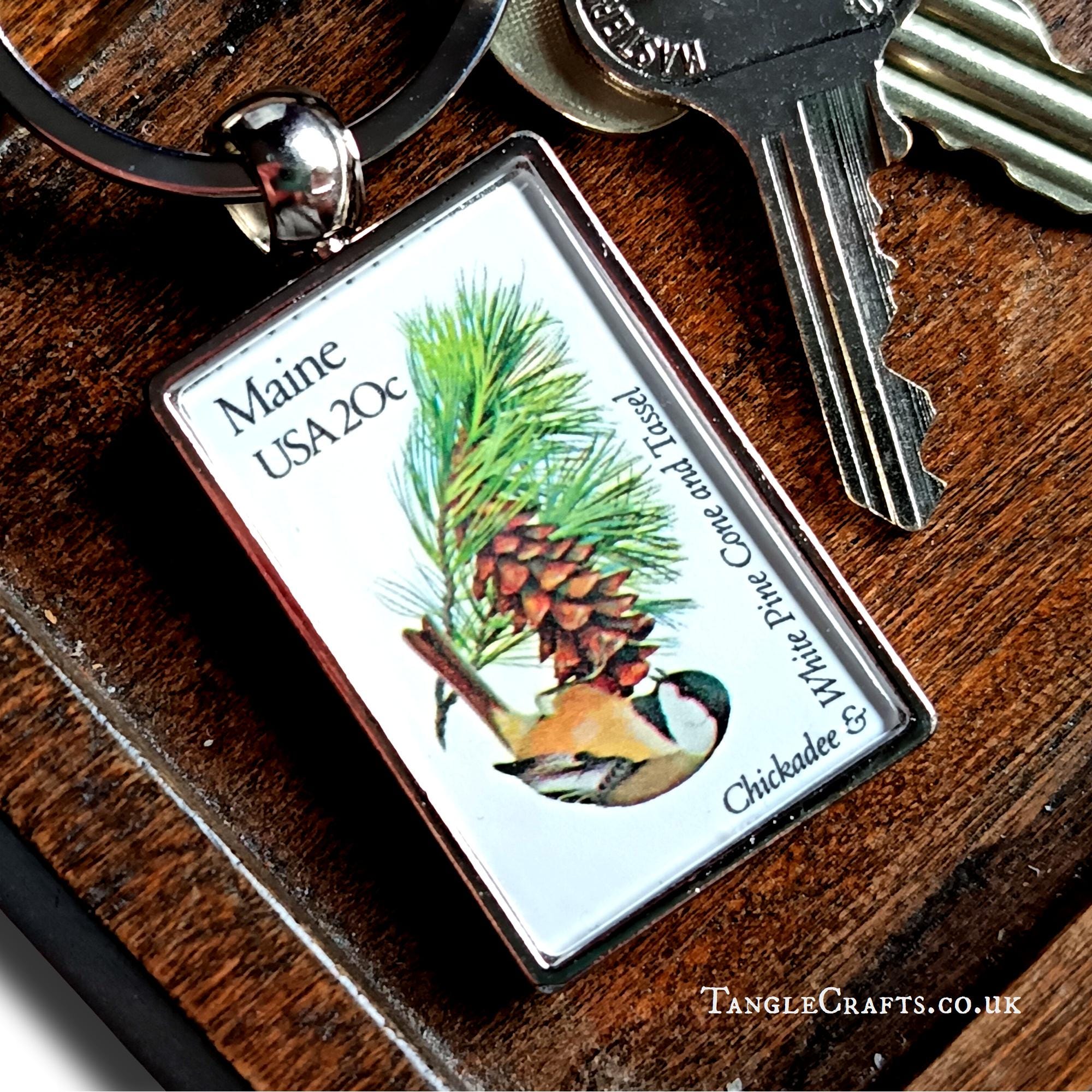 Celebrate the nature of Maine state! Featuring a chickadee with white pine cone, this keychain is made by upcycling a vintage 1980s postage stamp, encapsulating a genuine fragment of US postal history, just for you! A fun gift for any stamp collector, philatelist, letter writer, or bird/nature lover... Please read on for full details: