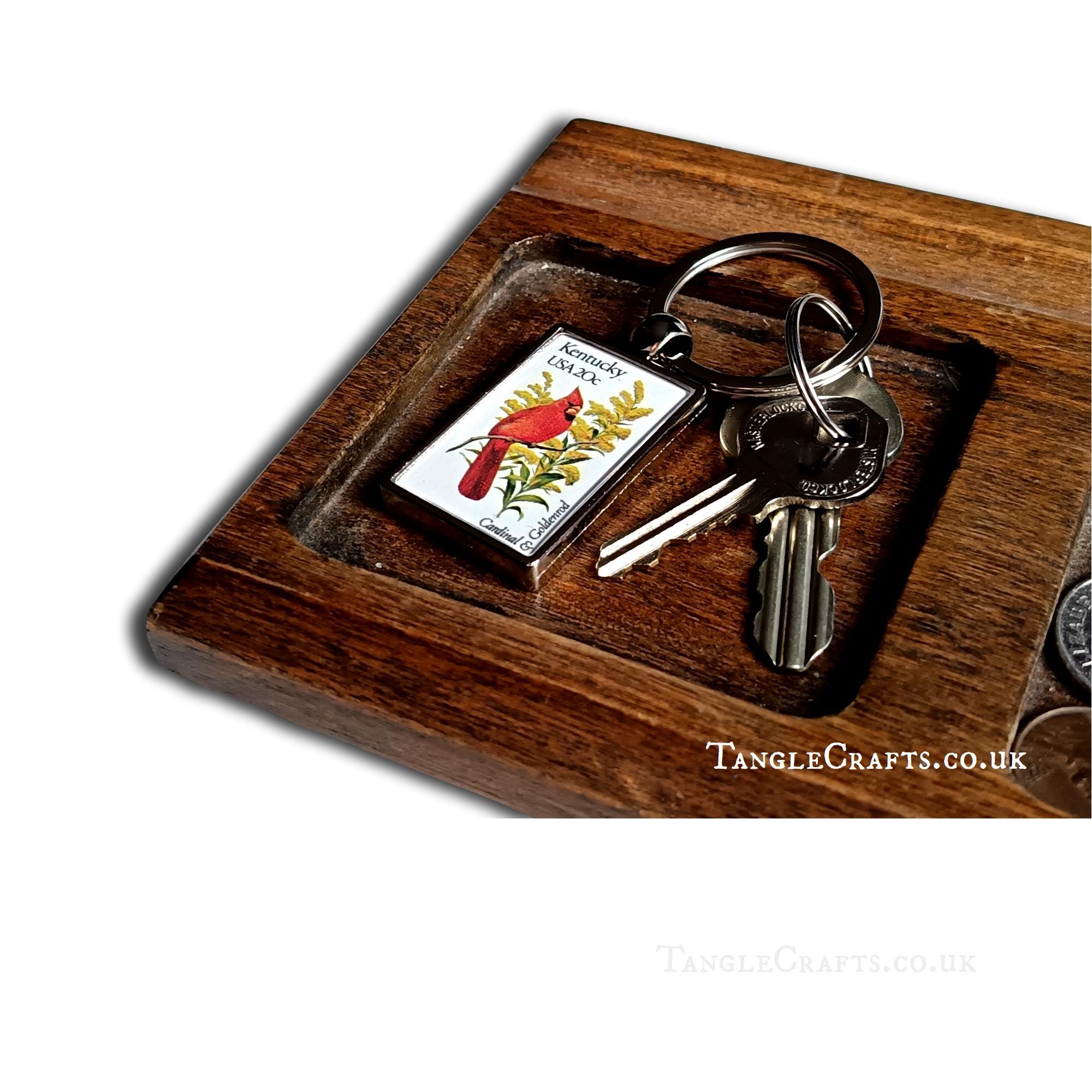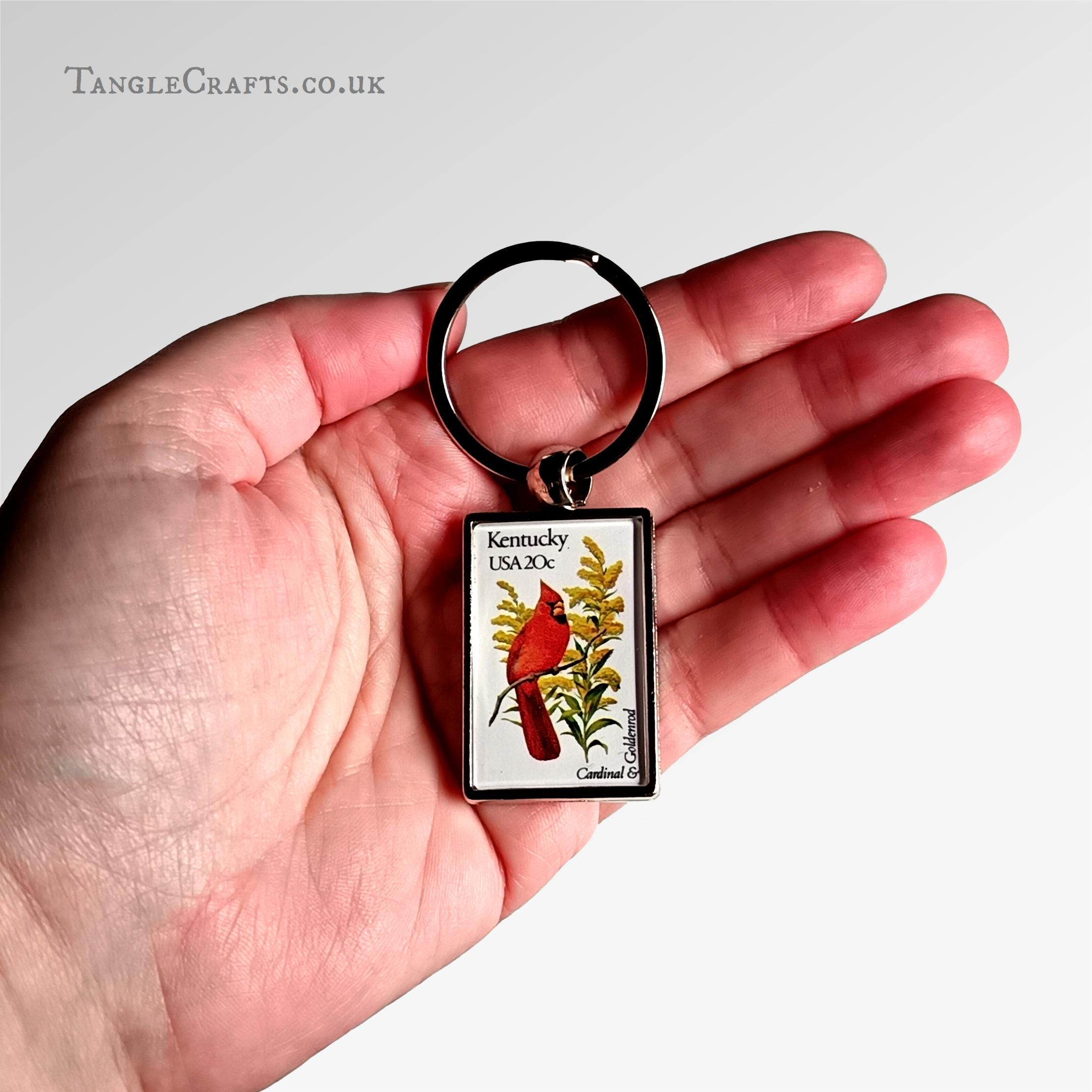 Celebrate the nature of Kentucky state! Featuring a red cardinal and goldenrod flower, this keychain is made by upcycling a vintage 1980s postage stamp, encapsulating a genuine fragment of US postal history, just for you! A fun gift for any stamp collector, philatelist, letter writer, or bird/flower lover... Please read on for full details: