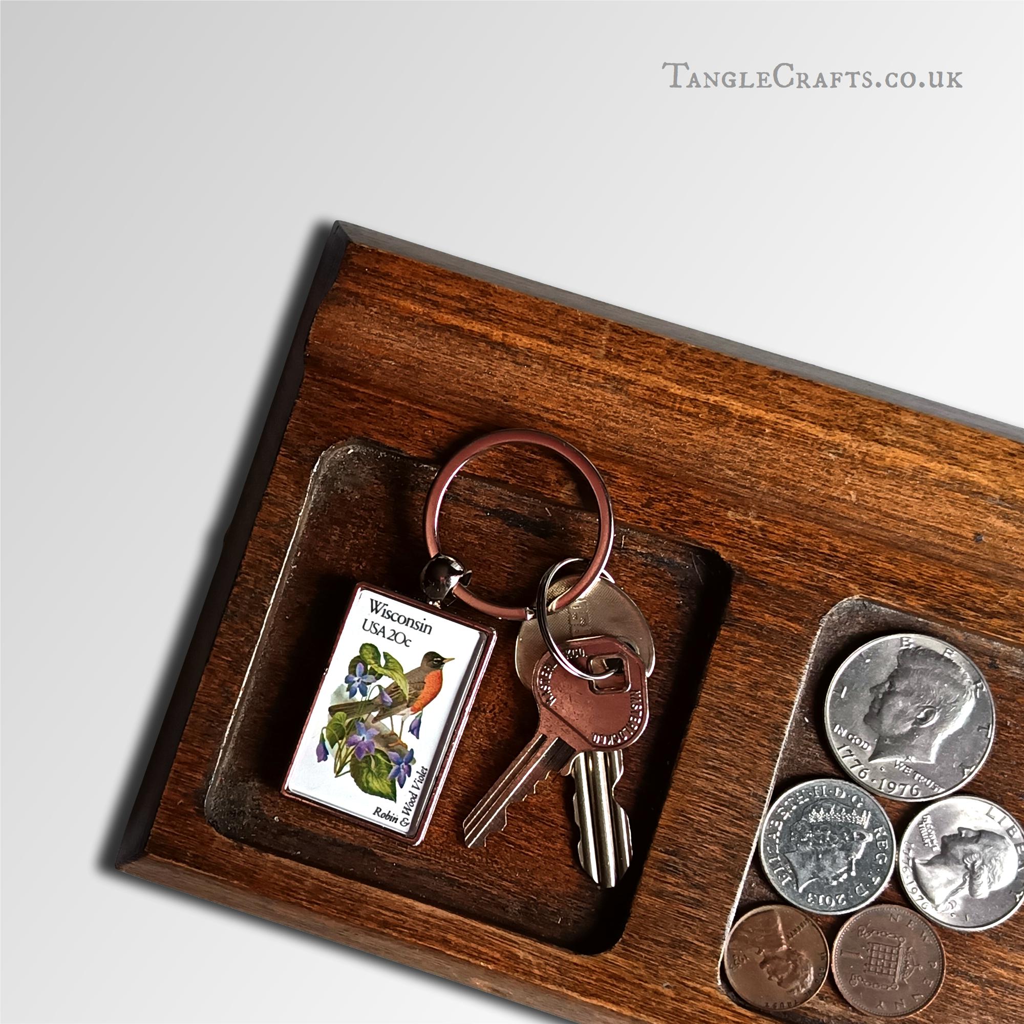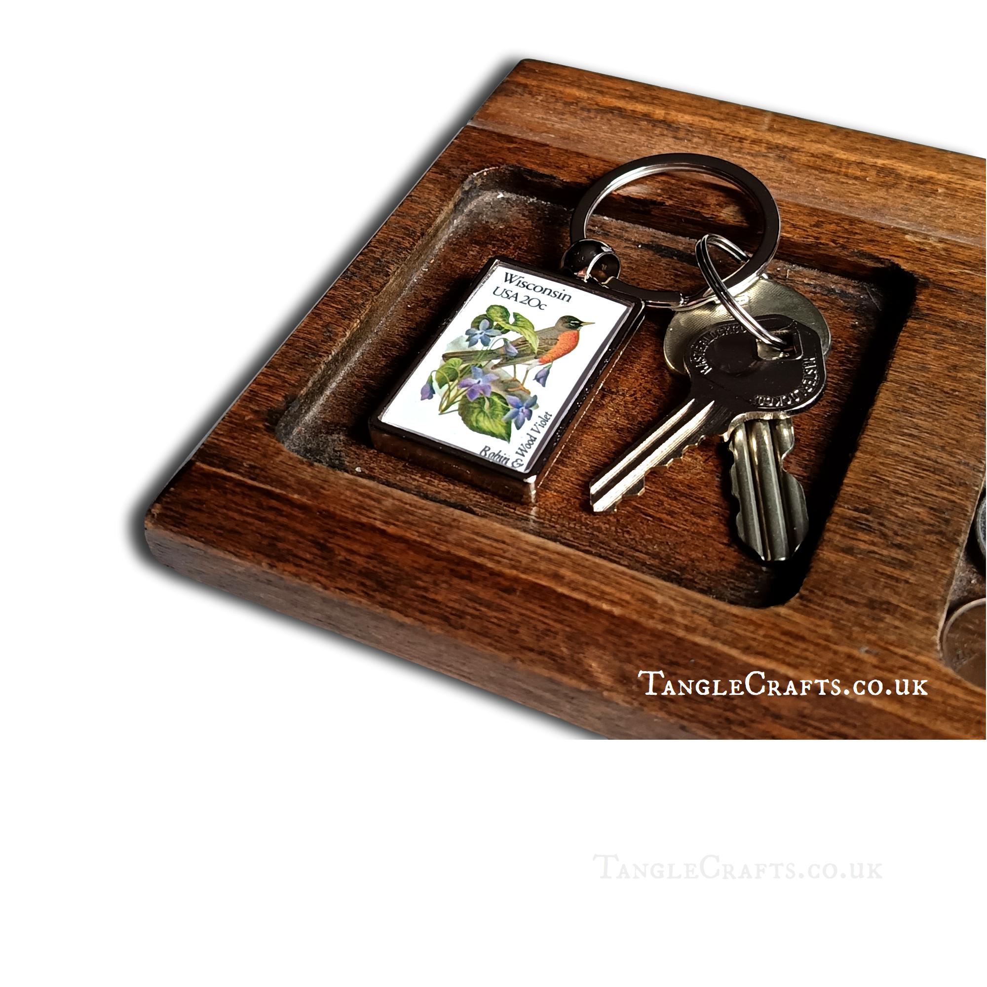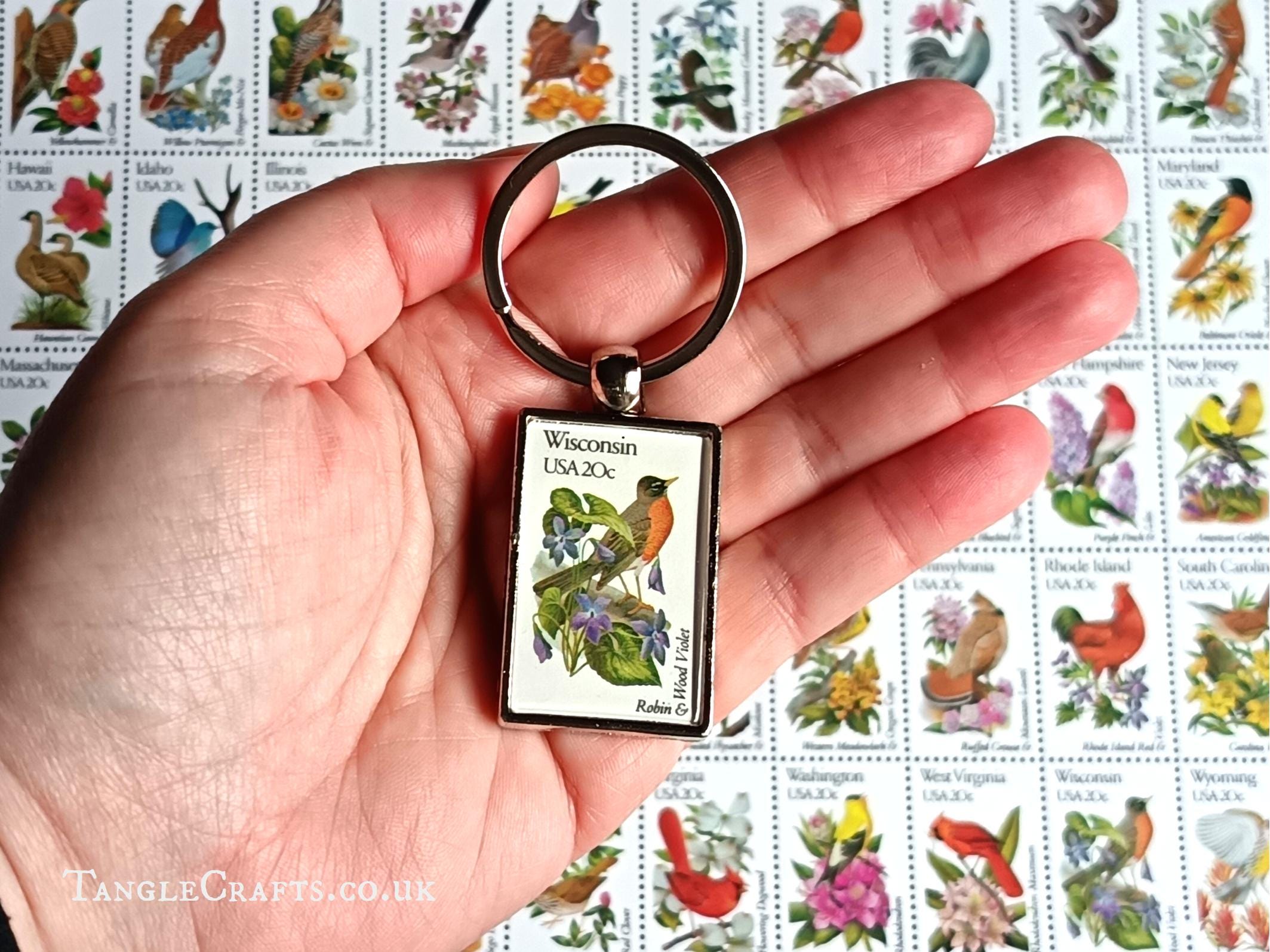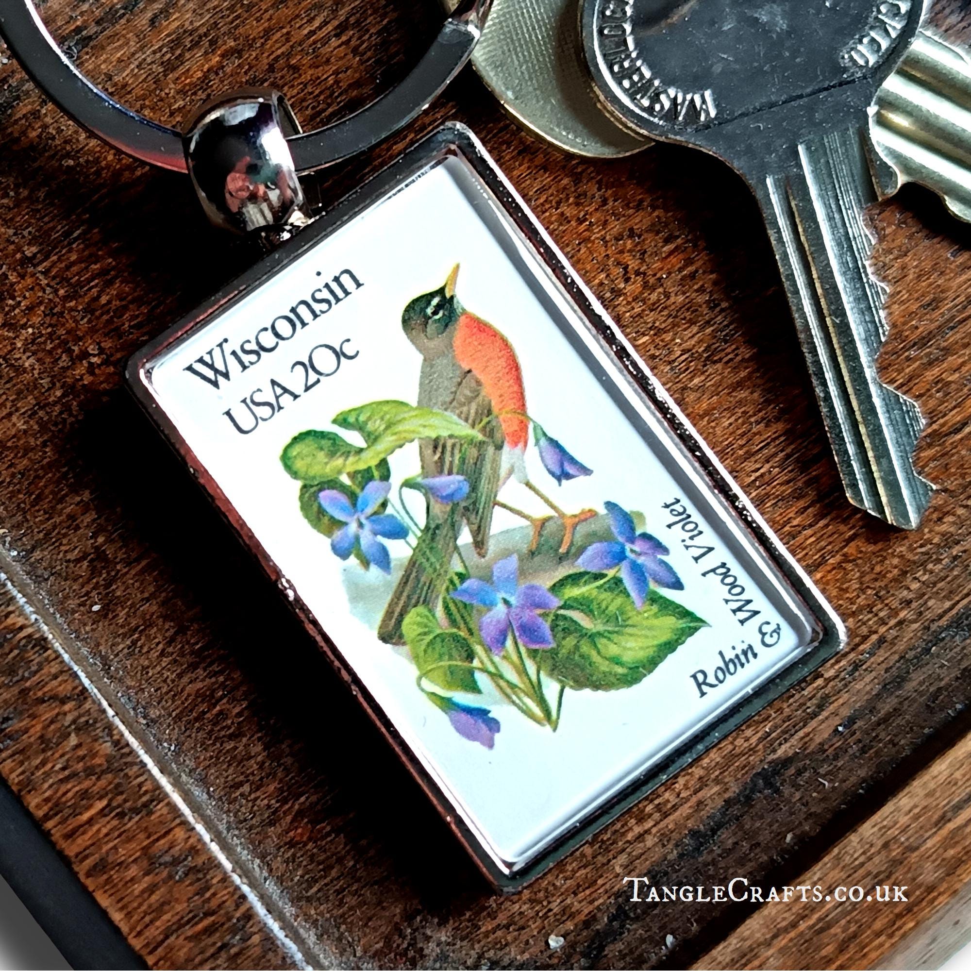 Celebrate the nature of Wisconsin state! Featuring a robin and wood violets, this keychain is made by upcycling a vintage 1980s postage stamp, encapsulating a genuine fragment of US postal history, just for you! A fun gift for any stamp collector, philatelist, letter writer, or bird/flower lover... Please read on for full details: