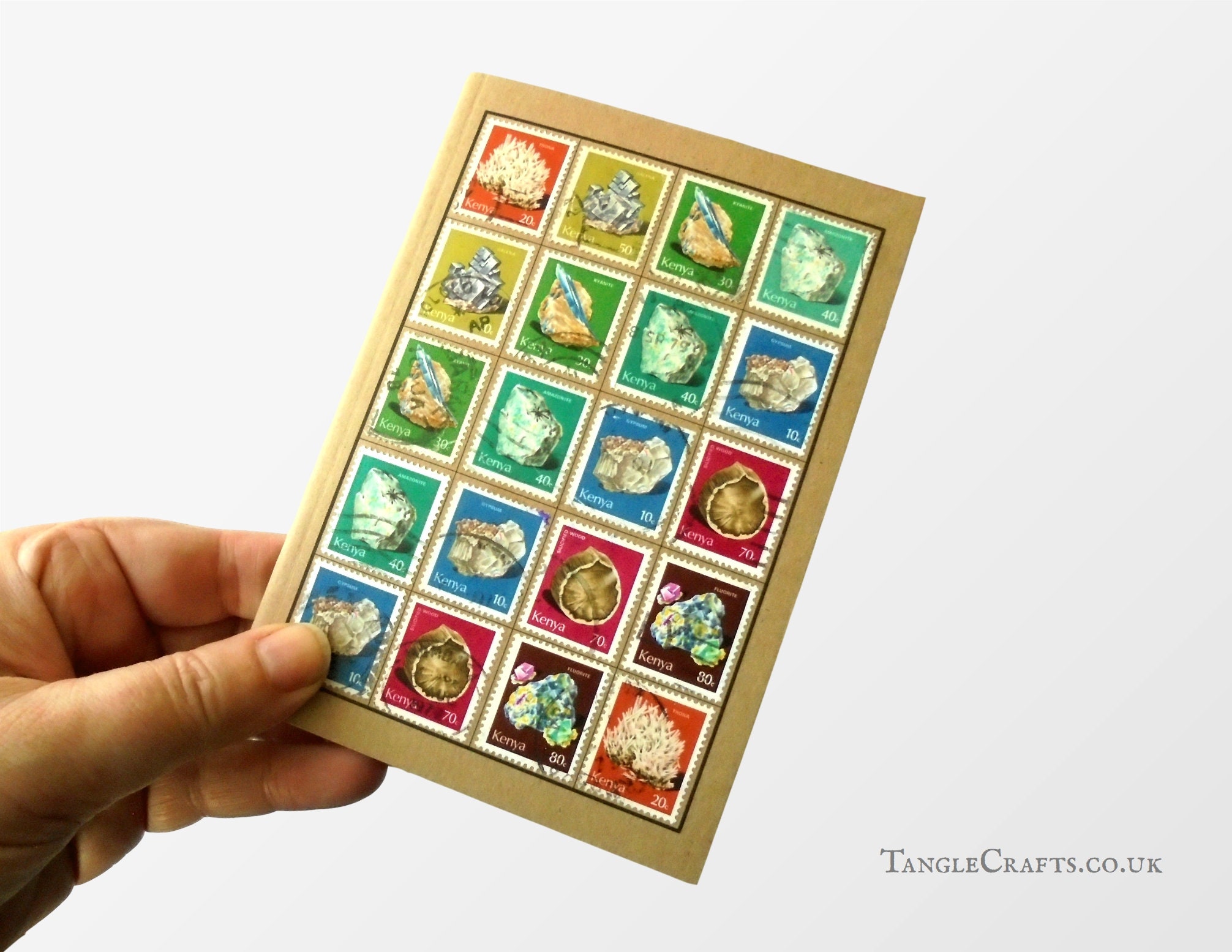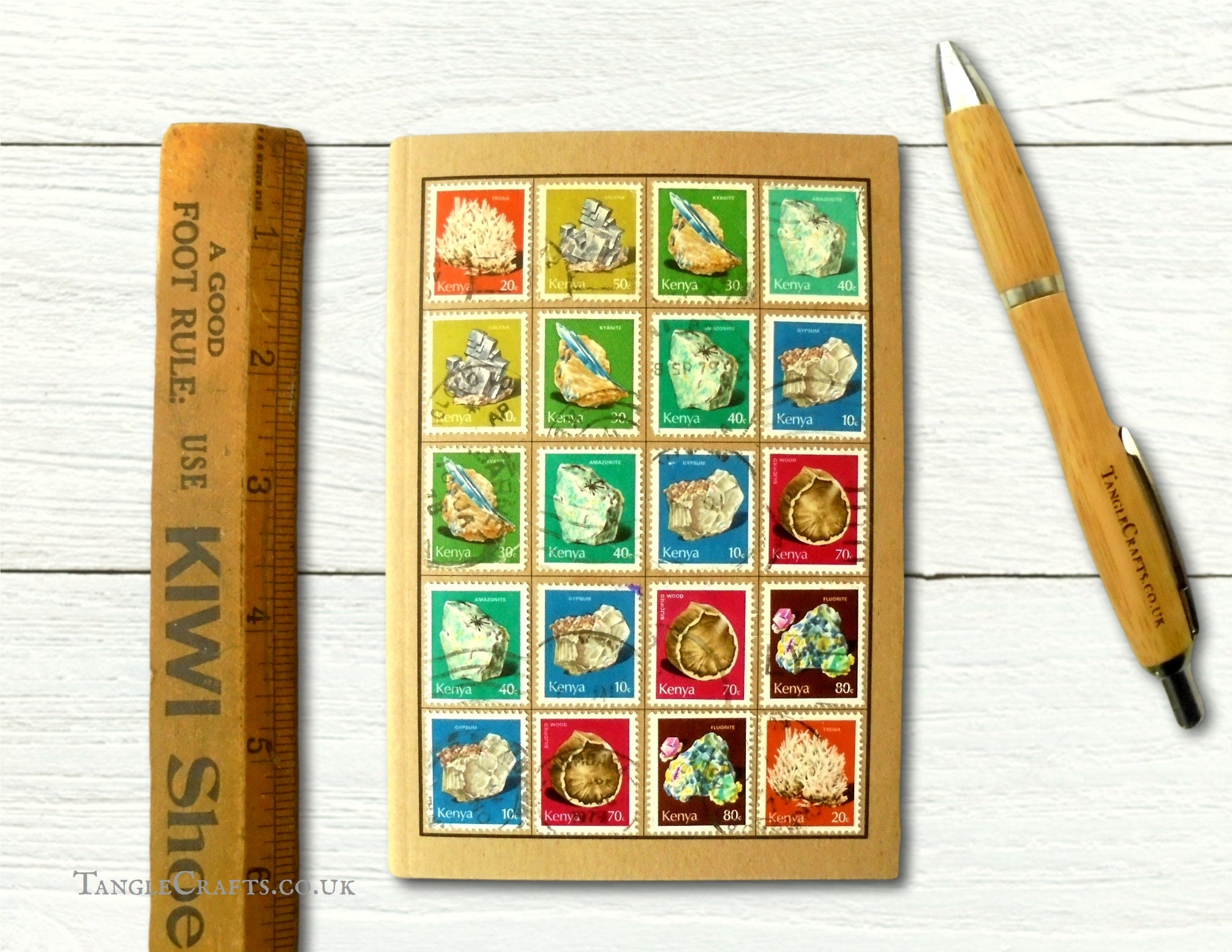 Inspired by old stamp albums, the front cover of this notebook has been upcycled with a grid of genuine vintage postage stamps from Kenya. Issued in the 70s & featuring an array of minerals displayed against rich jewel-toned background colours, this would make a truly one of a kind gift for any pebble collector or geologist! The ruled pages inside are perfect for recording discoveries, travel notes & memories, or scribbles of any kind. Please read on for full details: