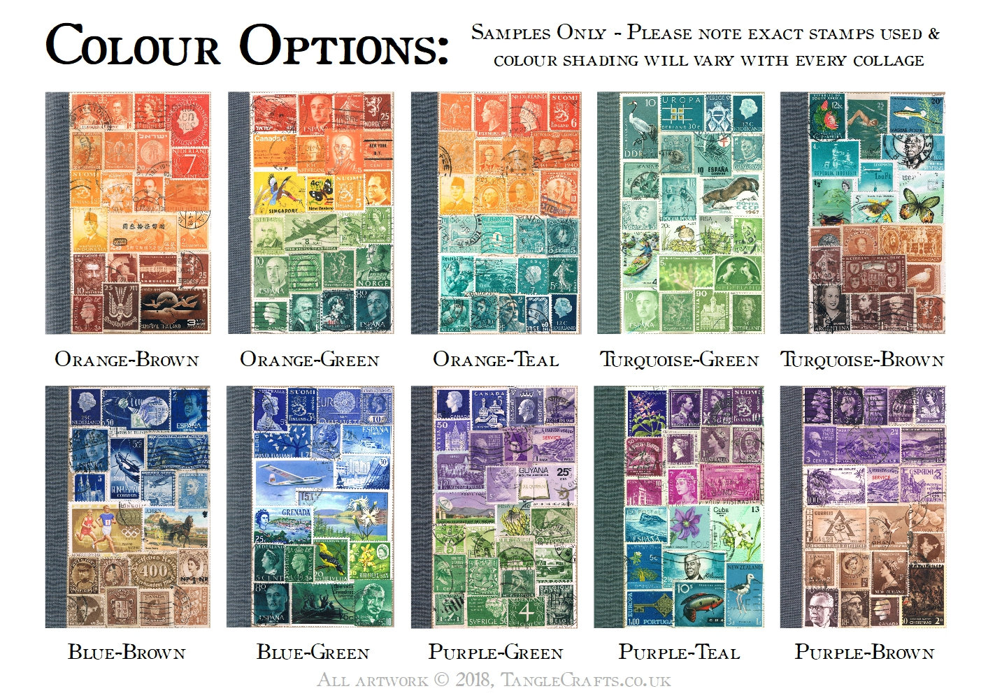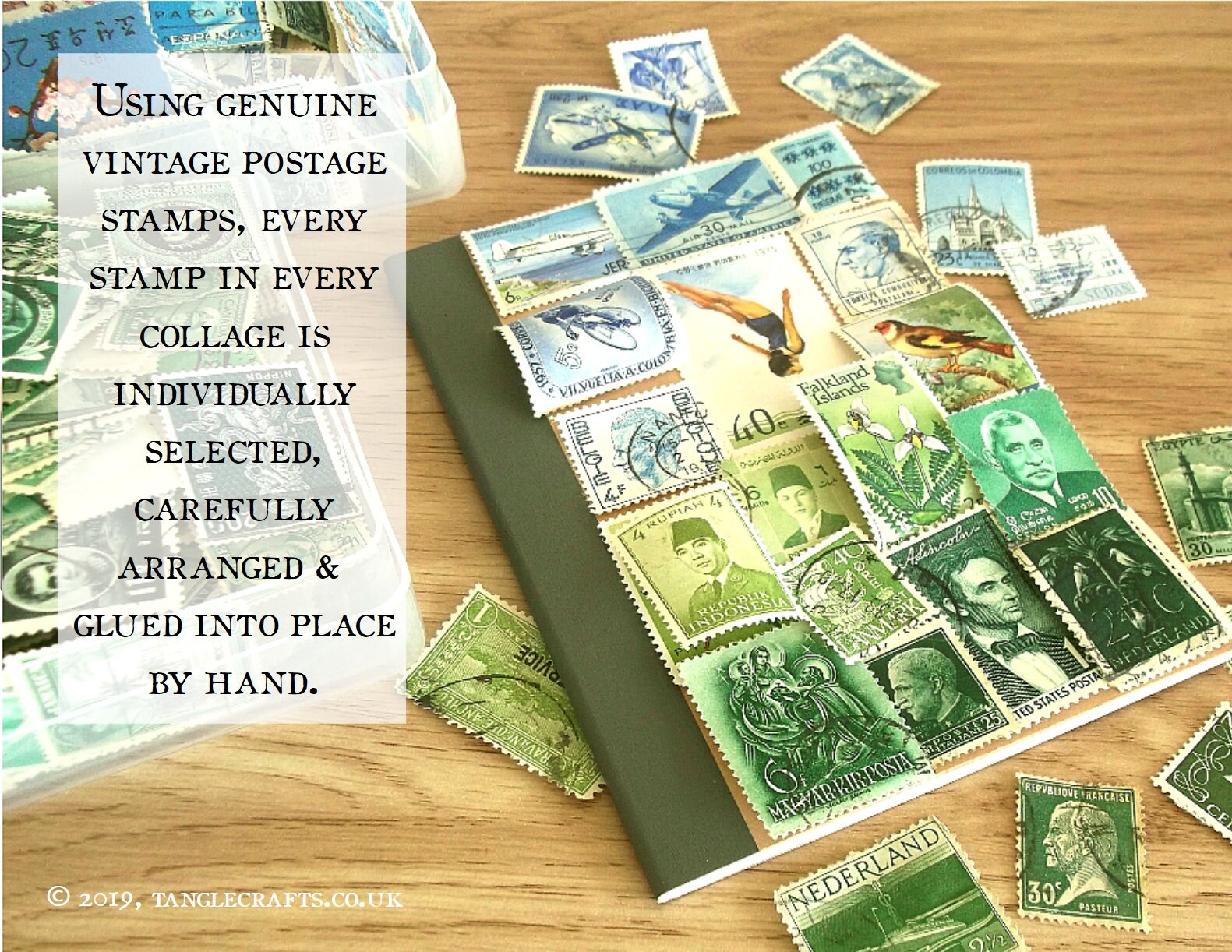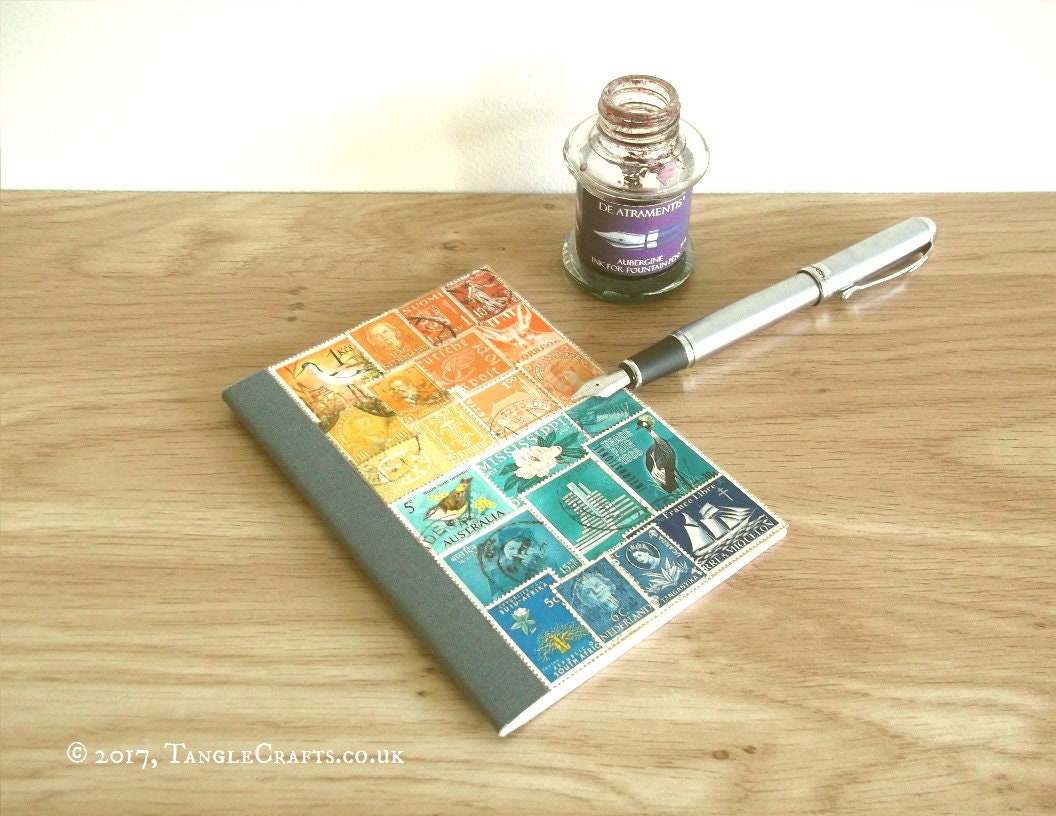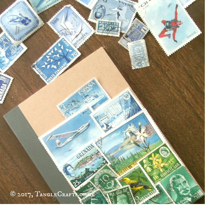 Every collage in my notebook series evolves from a very organic process: each postage stamp used is very carefully selected for colour and size to fit the random spaces and subtle colour progressions of your collage, creating an unrepeatable artwork, just for you. The stamps are glued into place with an acid-free, xylene-free adhesive then coated with a matt sealant, preserving some genuine fragments of postal history alongside your own recollections and notes. (You can read more about my process here: https://tanglecrafts.wordpress.com/process/ )