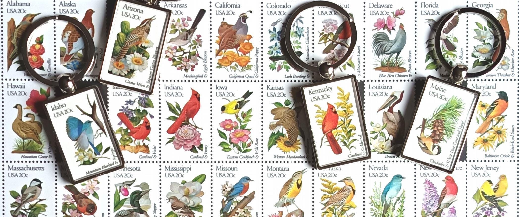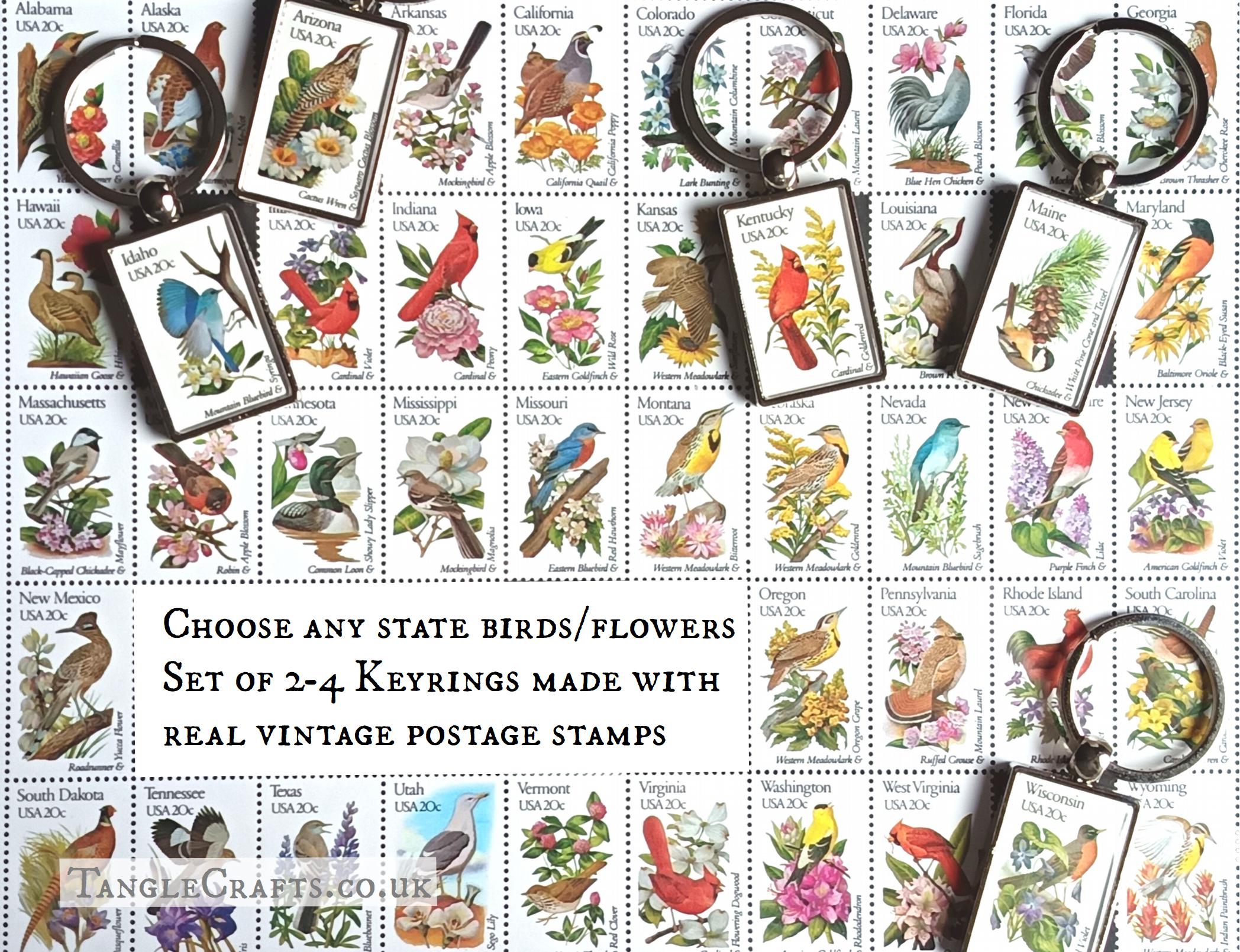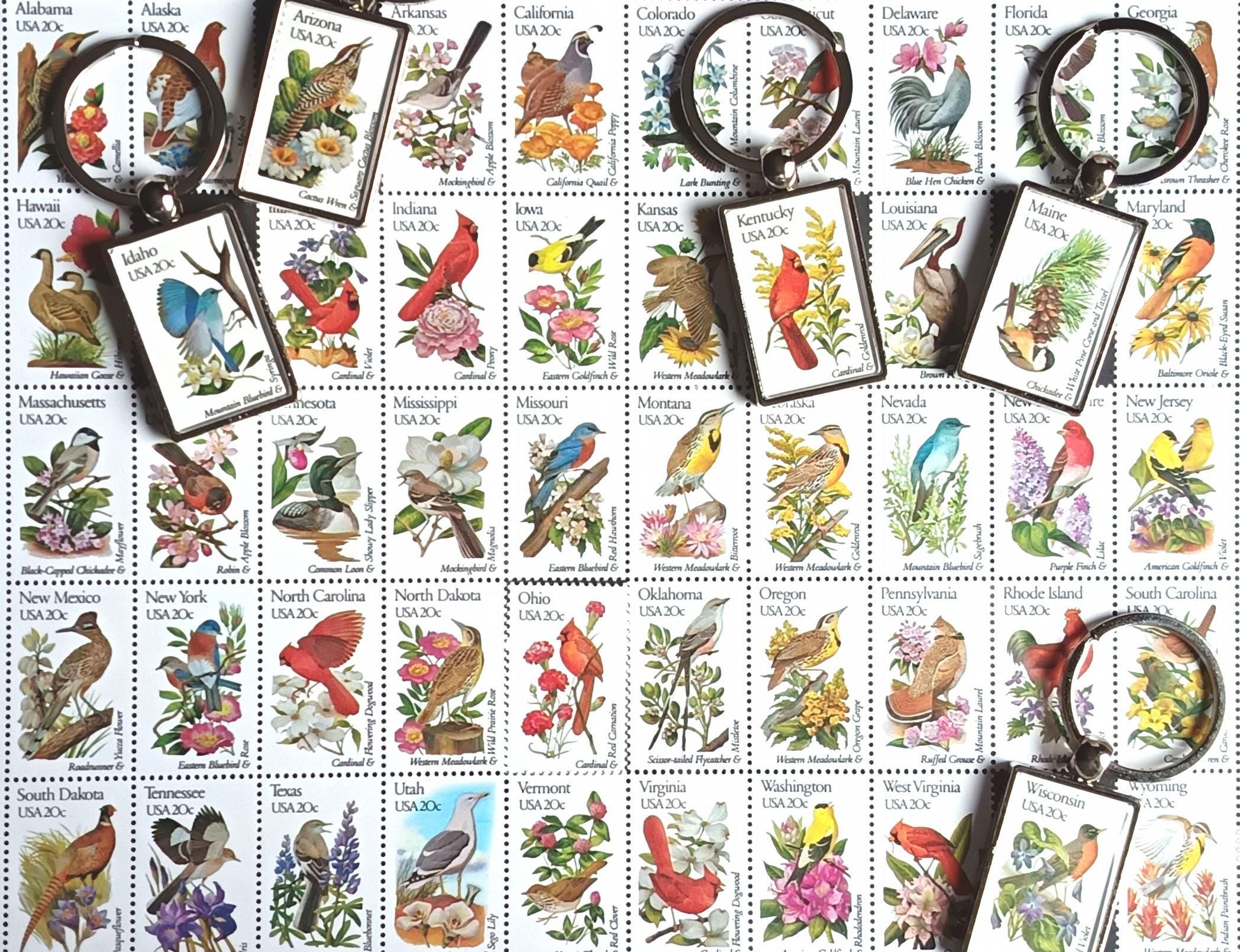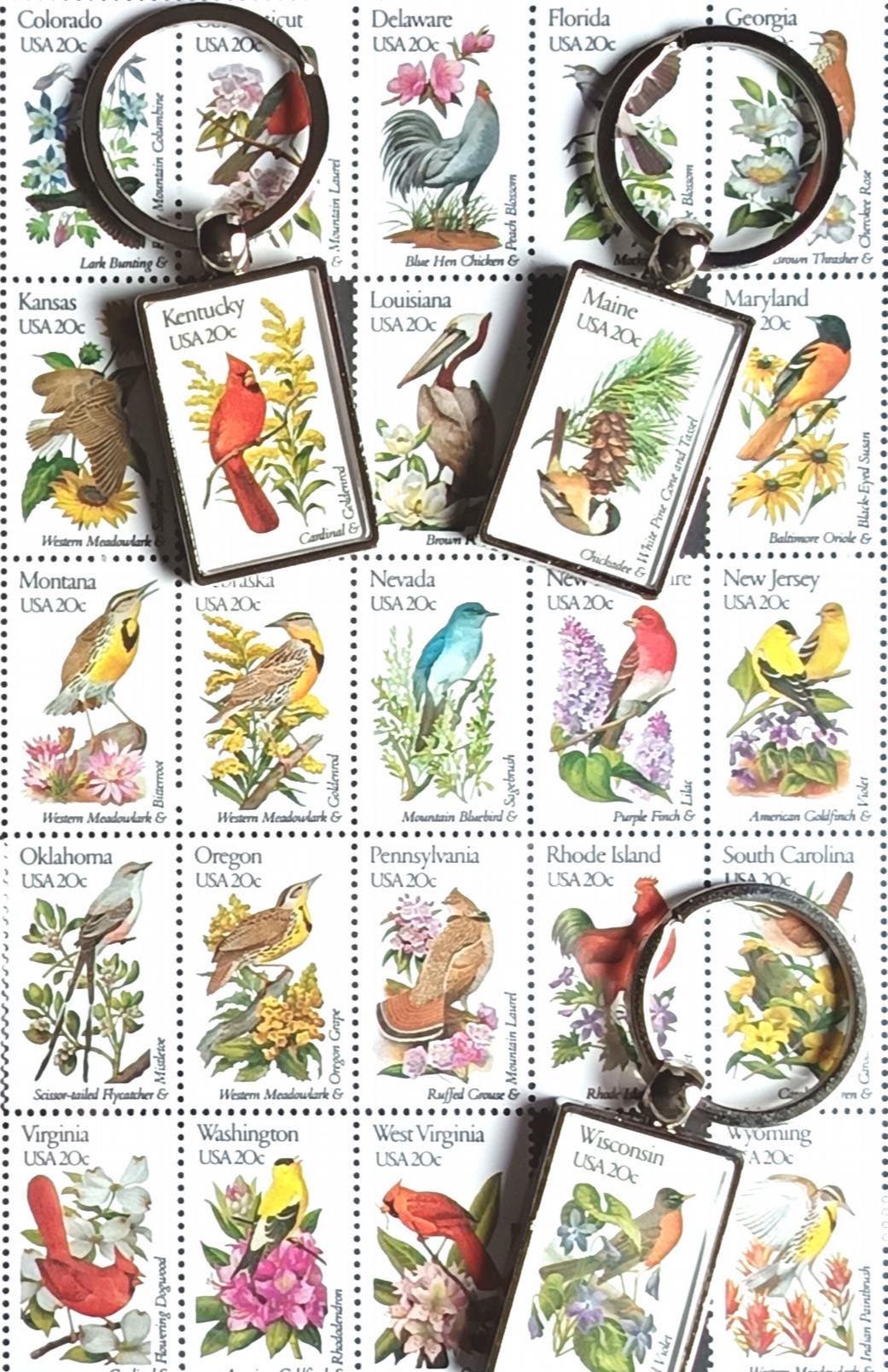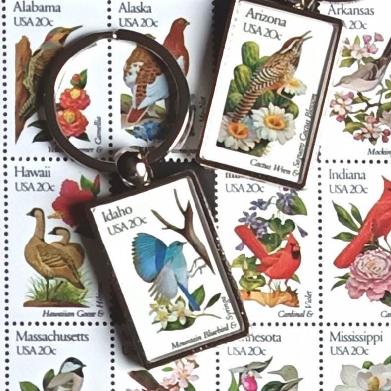 Celebrate your favourite US states! Choose from the birds & flowers of 50 states, as depicted on this series of 1982 postage stamps. Each keychain is made by upcycling a genuine stamp, and encapsulates a genuine fragment of US postal history, just for you! A fun gift for any nature loving stamp collector, philatelist, letter writer, or traveller... Please read on for full details: