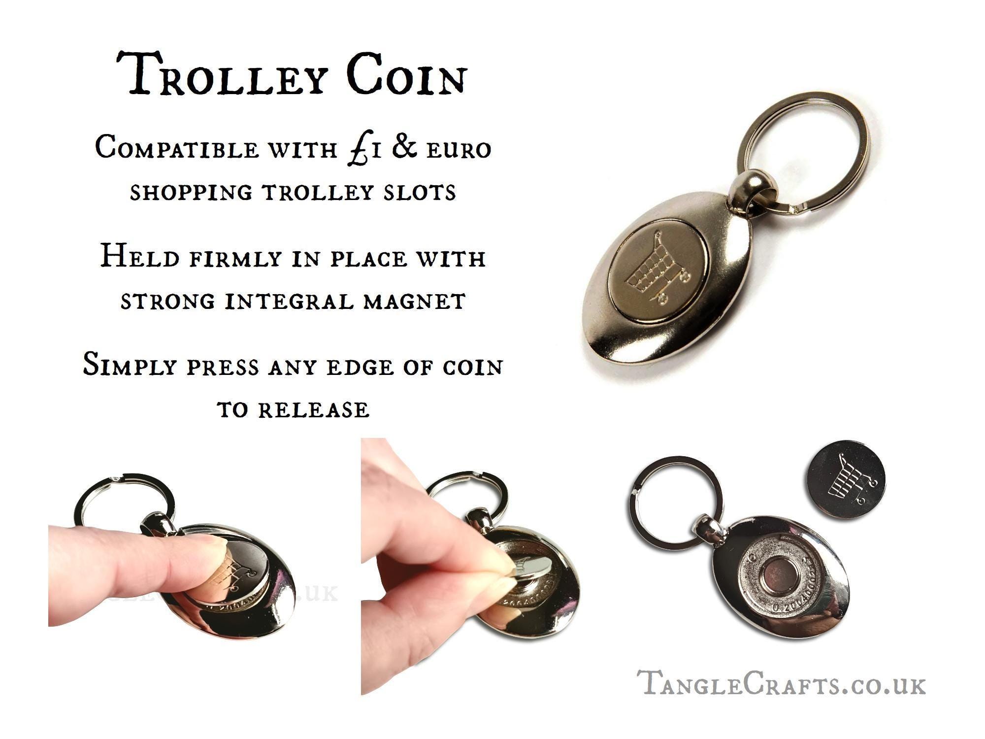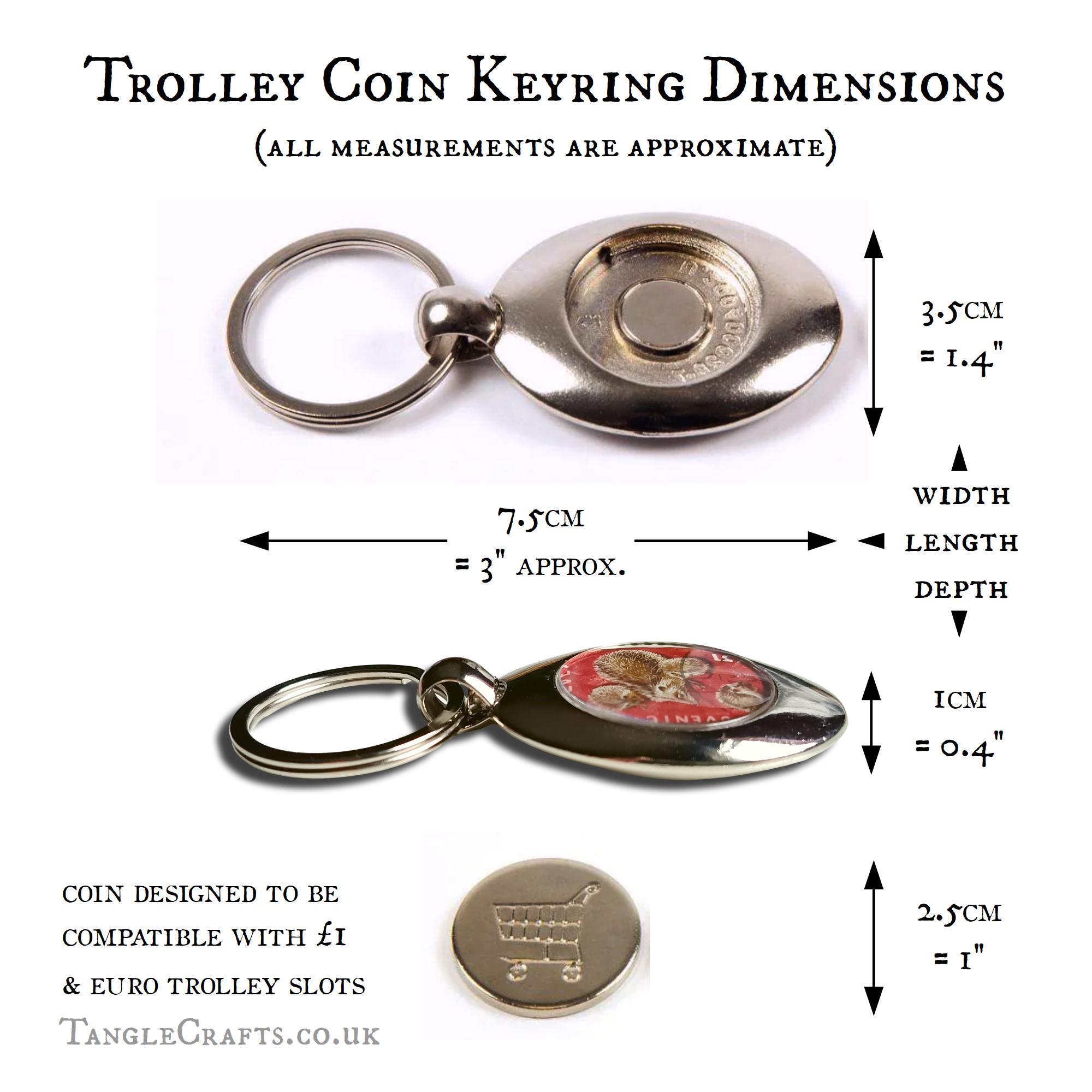• The trolley coin is a solid metal disc measuring approx. 25mm diameter. It is designed to fit both British & EU supermarket shopping trolley slots (if you are not in one of these regions, the token is unlikely to work but the keyring itself is still perfectly functional!)