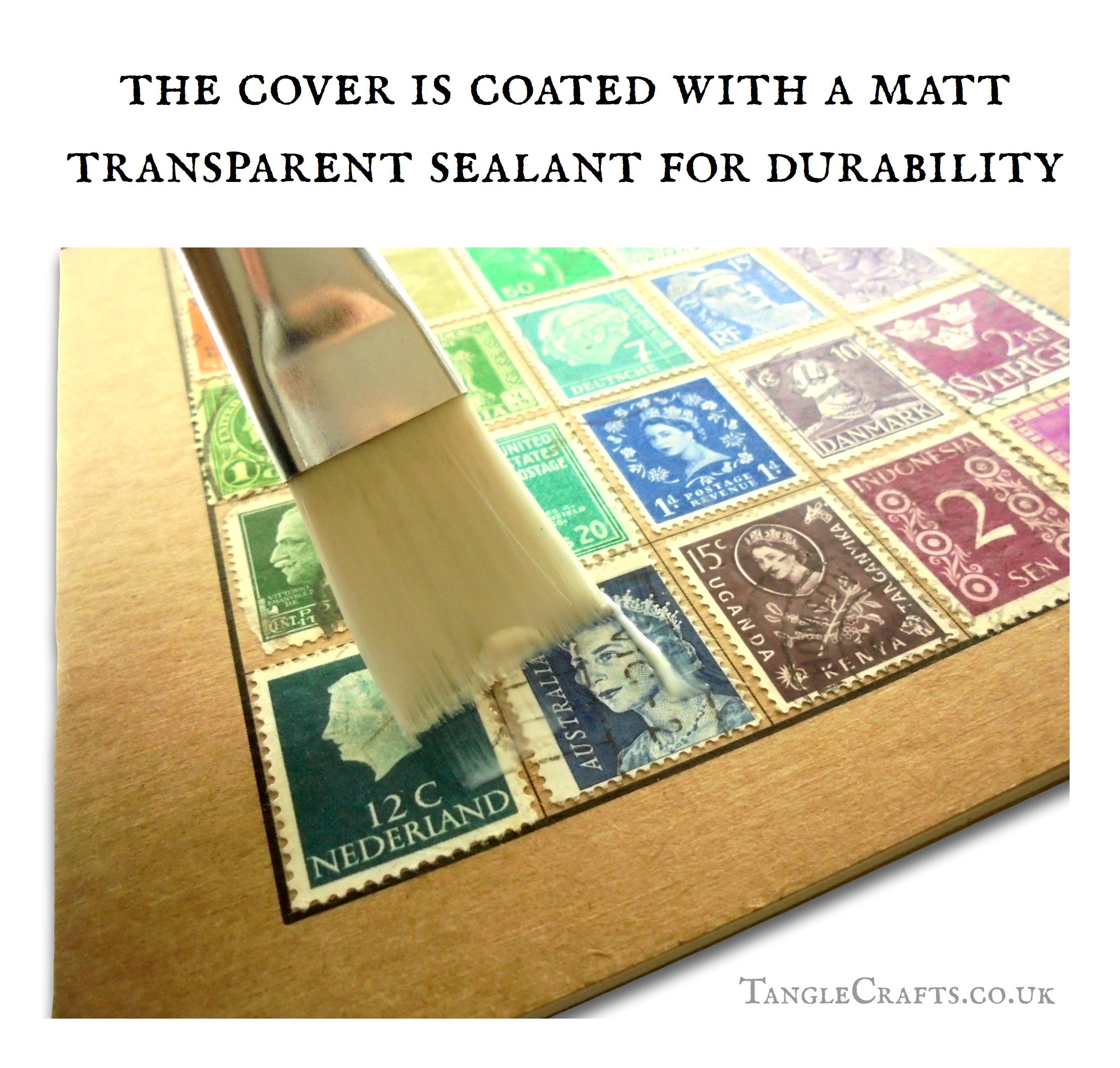 The stamps are glued into place with an acid-free, xylene-free adhesive then coated with a matt sealant, preserving some genuine fragments of postal history alongside your own recollections and notes. The reverse of the collage (inner front of your book) will be individually signed using an archival quality ink, and date-stamped with the date of collage.