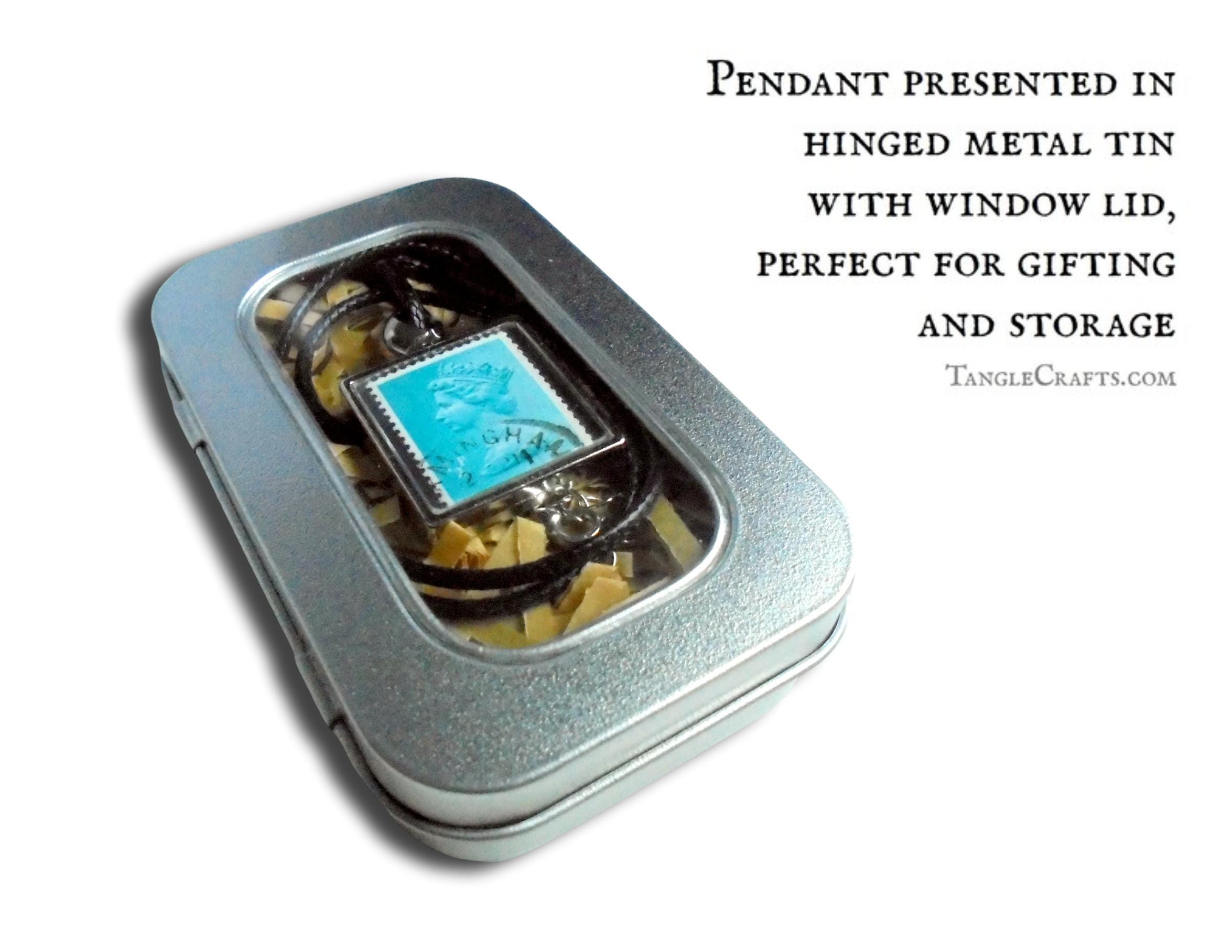 • Your pendant will be visible through the transparent window in the lid of the tin. Only one side of the pendant can be displayed at a time, so if you have a strong preference which stamp is made visible, please include a note at checkout.