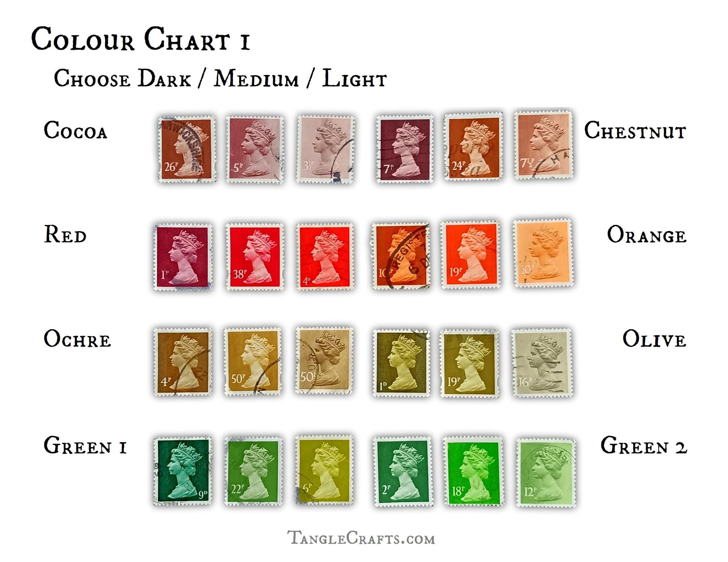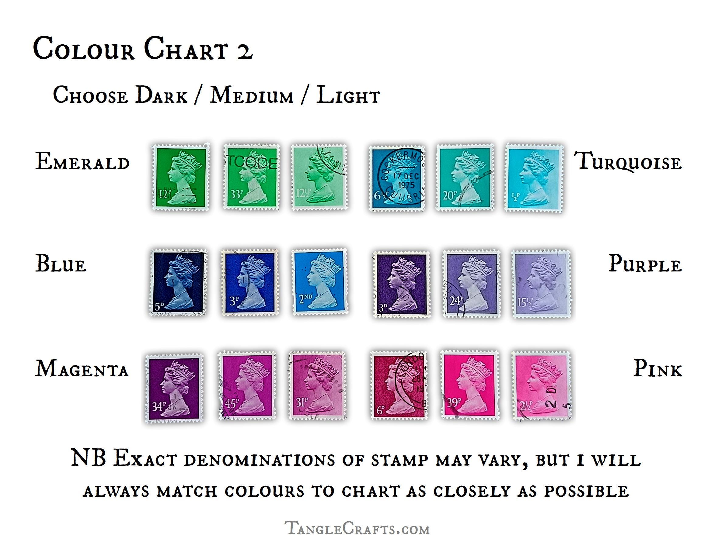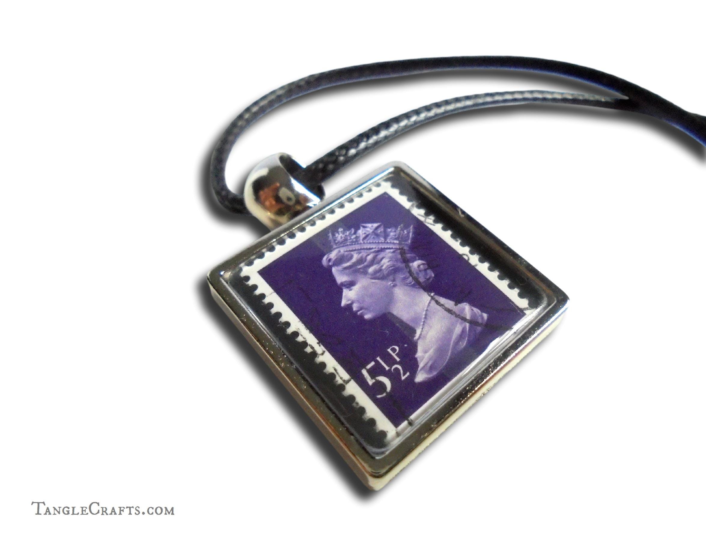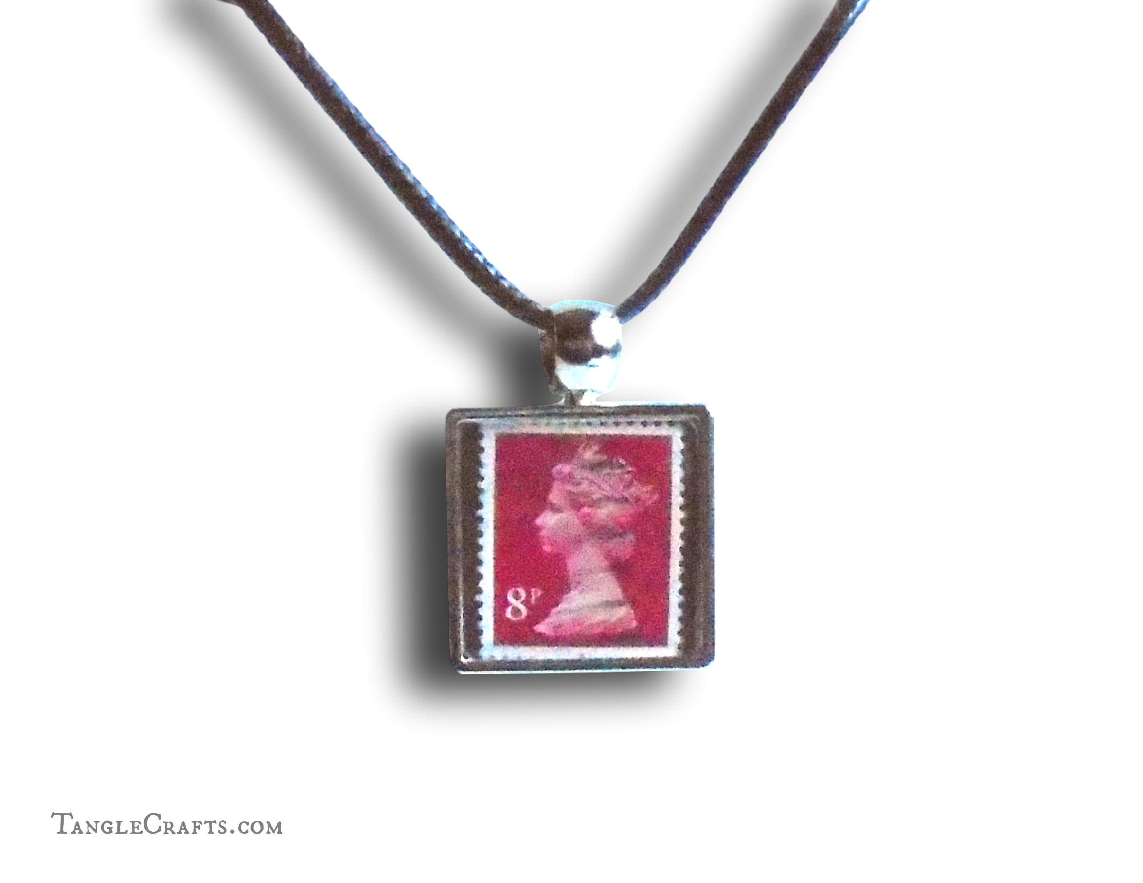 • The classic stamp design is by Arnold Machin, first issued in 1967 with new colours and shades issued every year until 2019. Your pendant will be made with one of the older stamps (pre-2000).