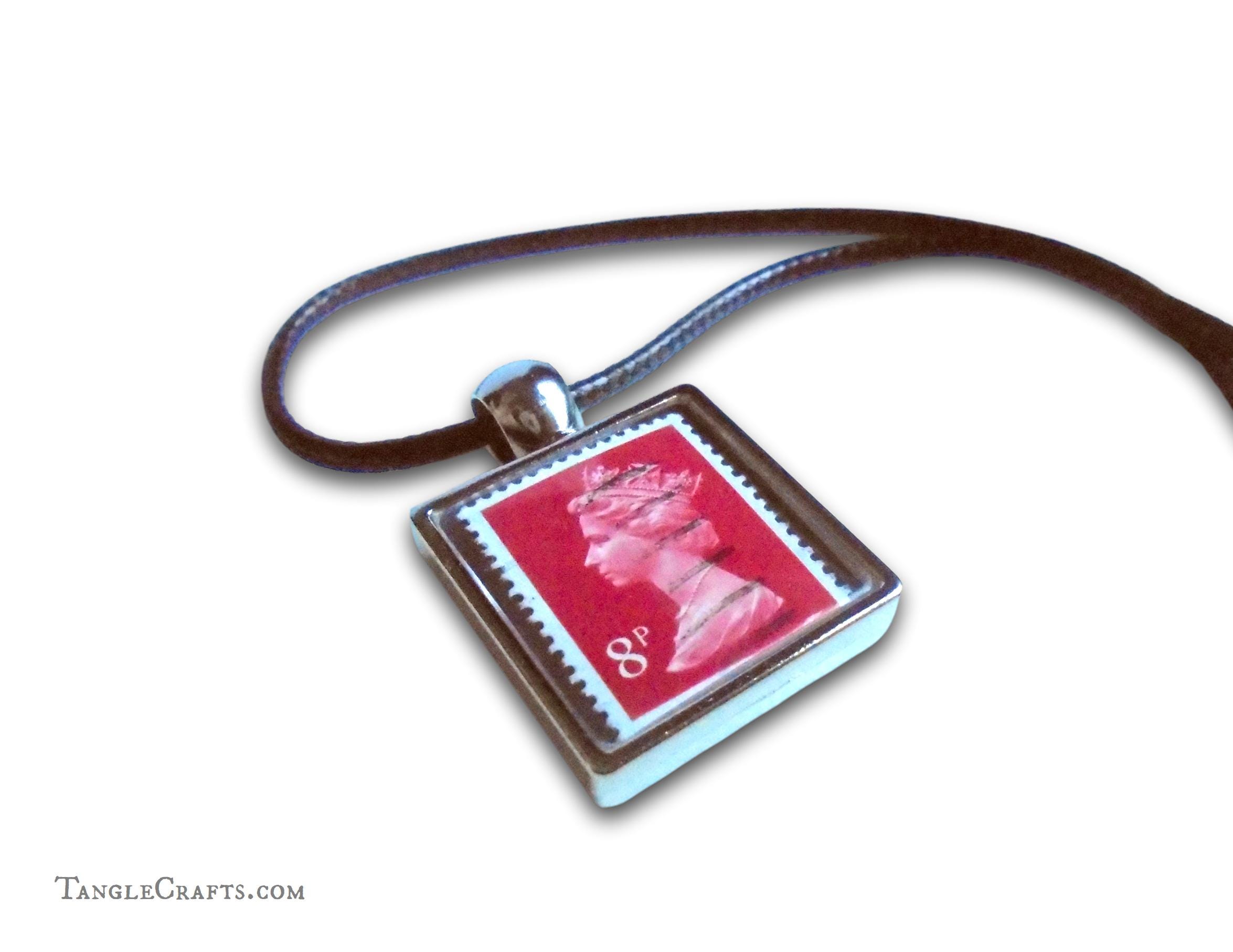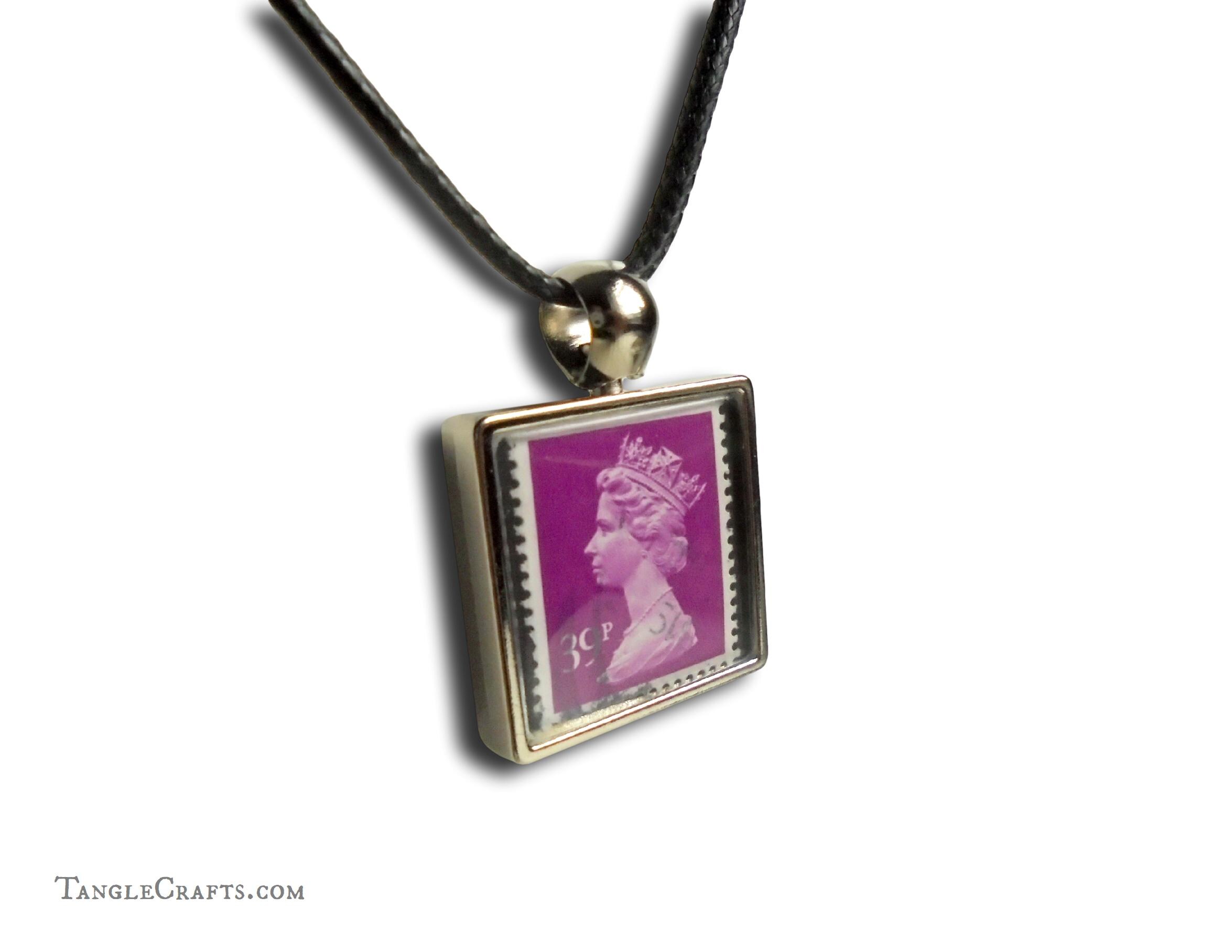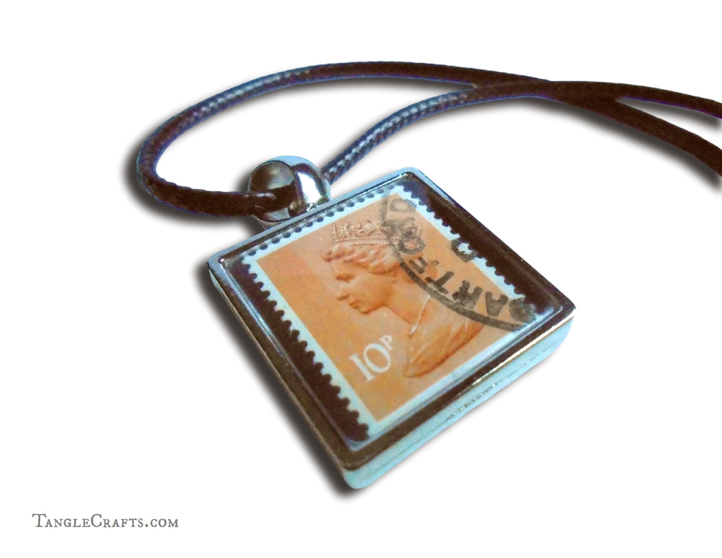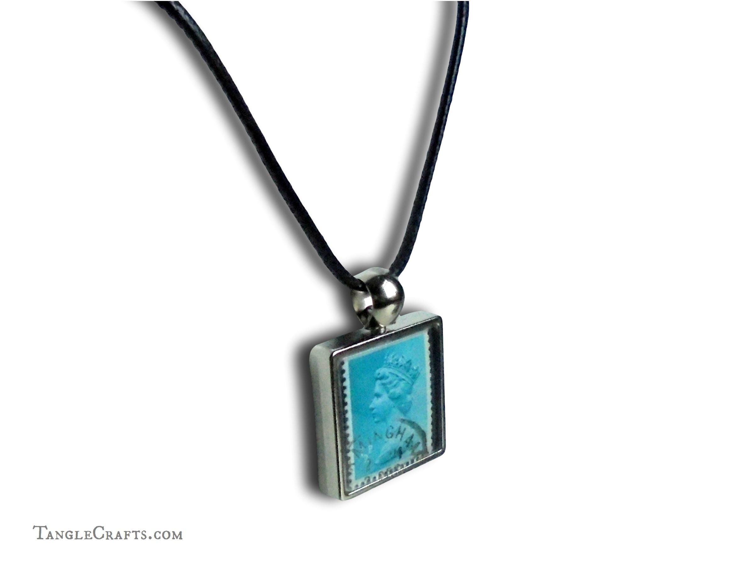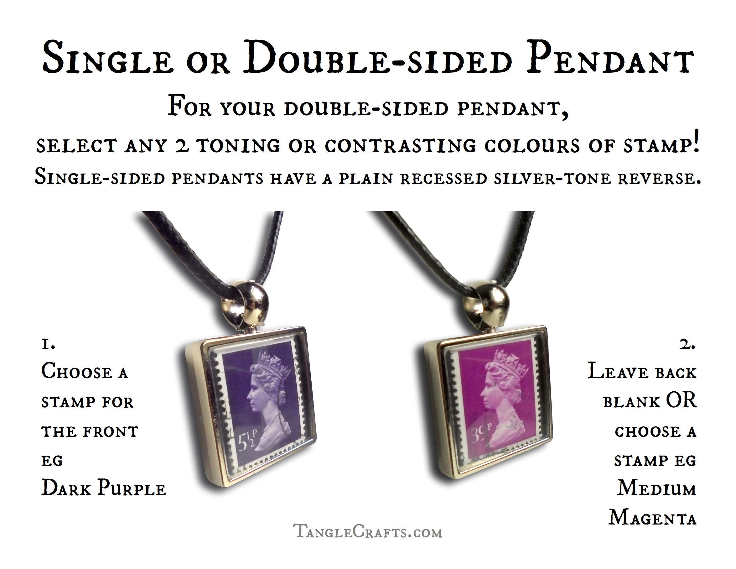 • Either one or two genuine vintage stamps will be captured in the pendant casing. If you select a single-sided pendant, the reverse is a plain recessed silvertone metal.