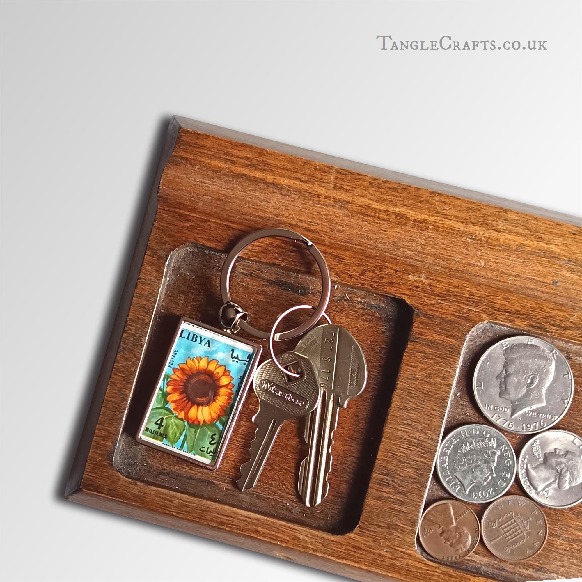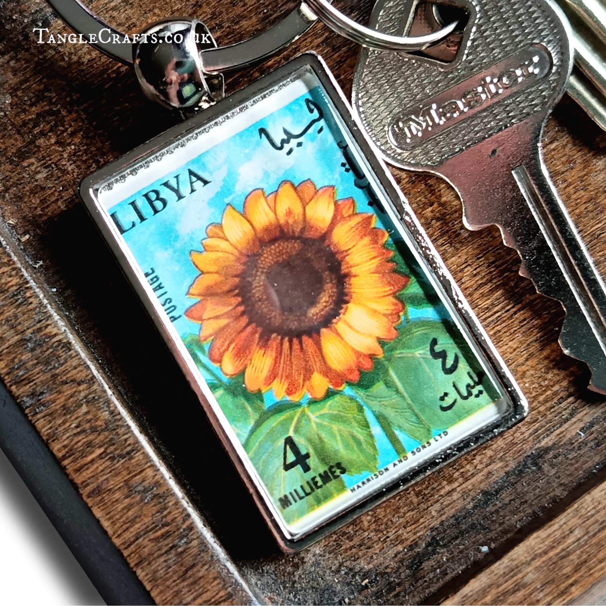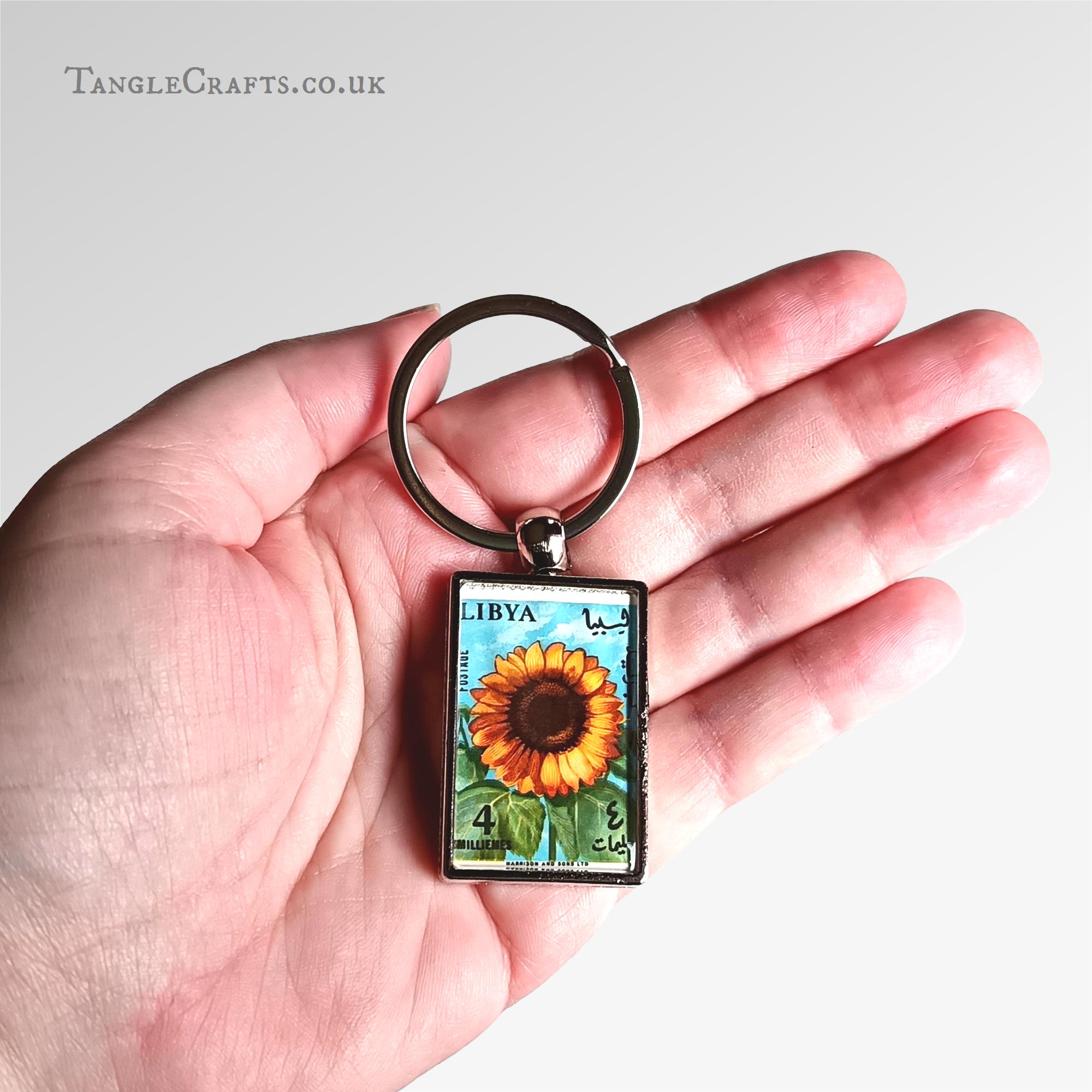 This stunning, one of a kind sunflower keychain will brighten up every day! Encapsulating a genuine fragment of postal history, it is a fun gift for any stamp collector, letter writer, nostalgic traveller, or flower/garden/nature lover...! Please read on for full details: