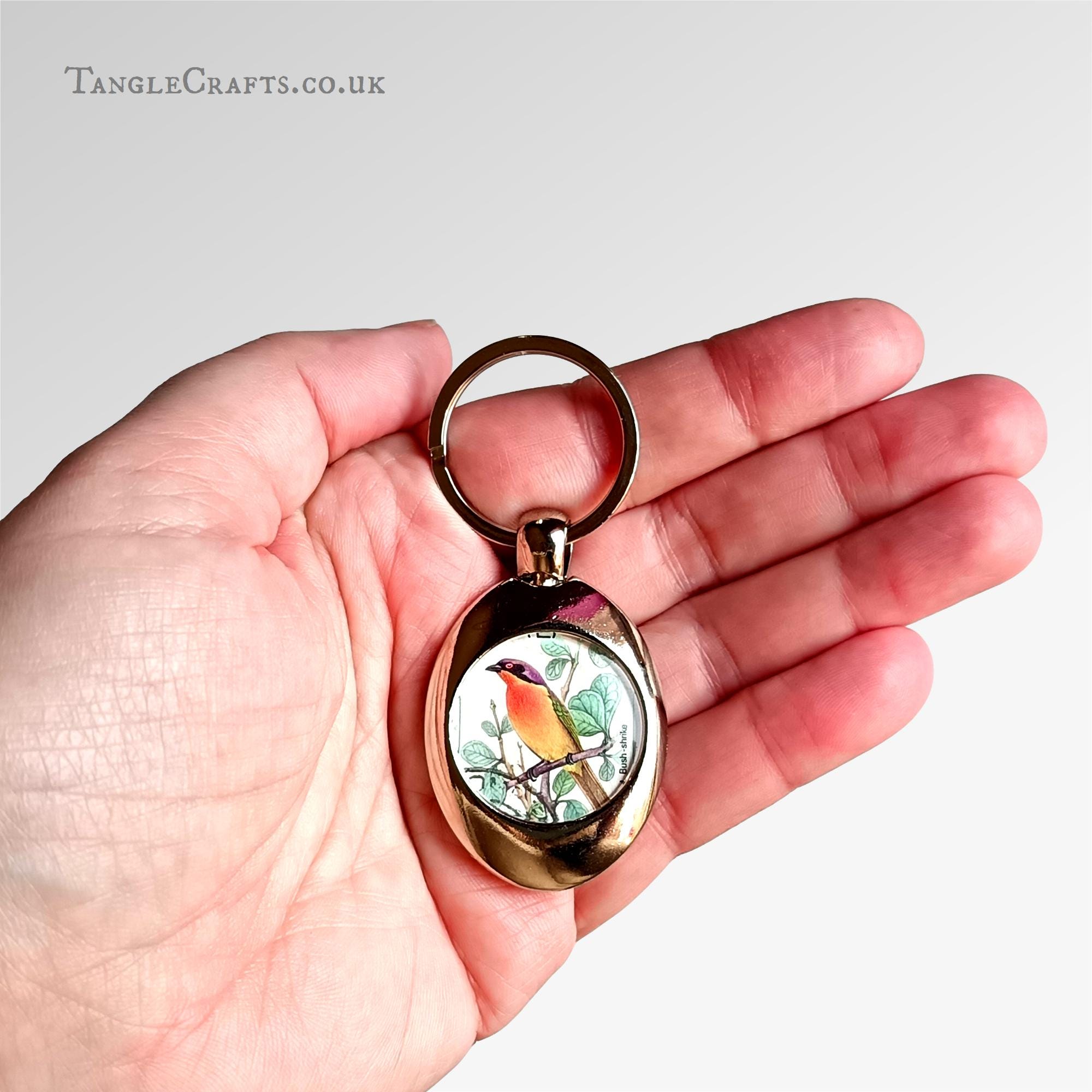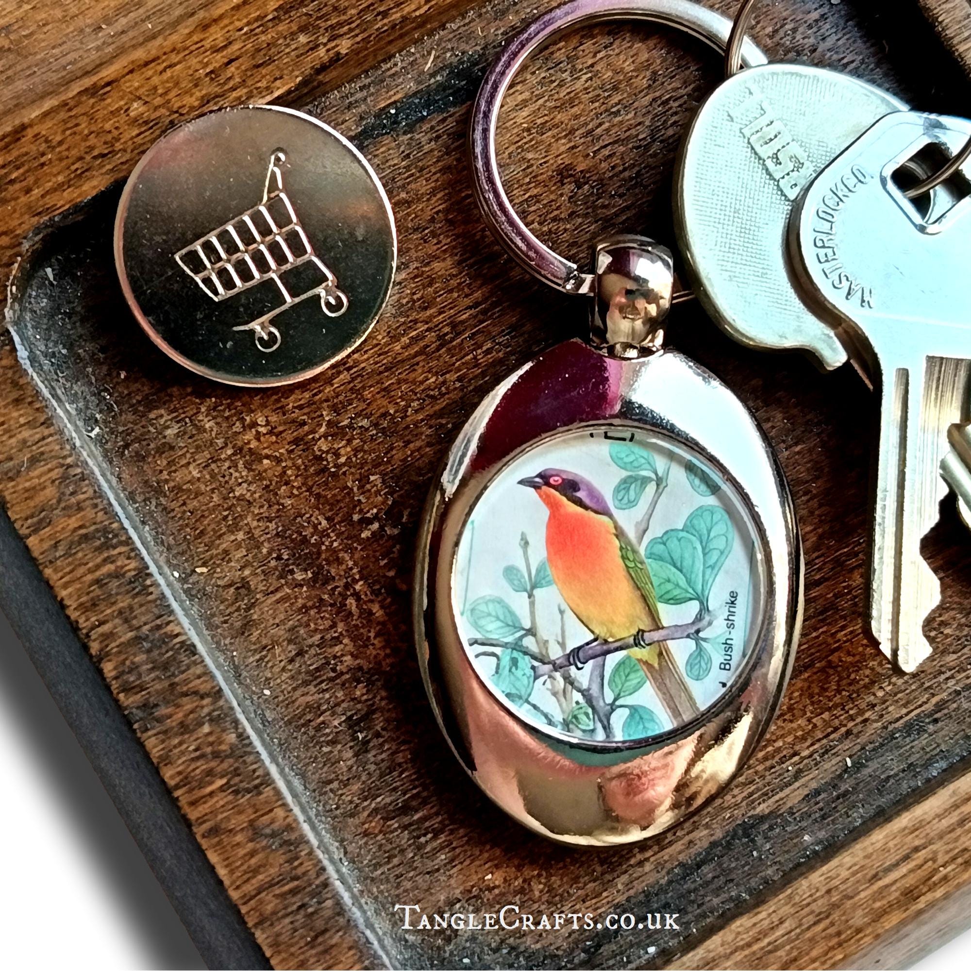 This attractive & multifunctional colourful bird keyring is made with a real vintage postage stamp from the 80s - the perfect gift for any bird-loving philatelist. The sturdy metal keychain doubles up functionality with a handy UK/EU trolley coin on the reverse, so it is twice as useful! Please read on for full details: