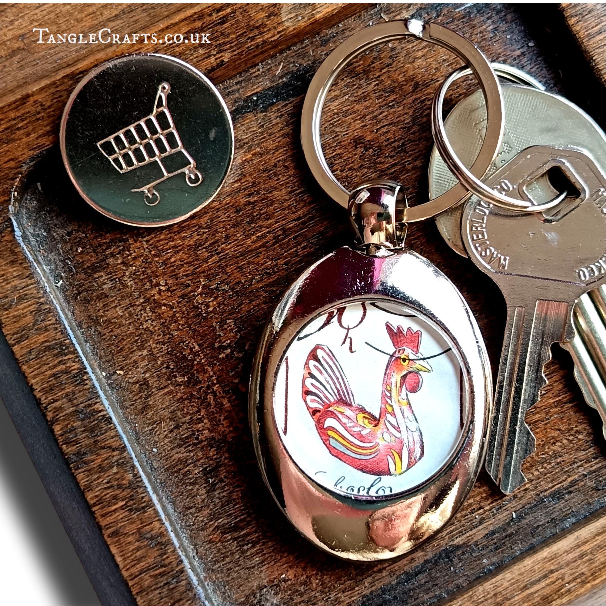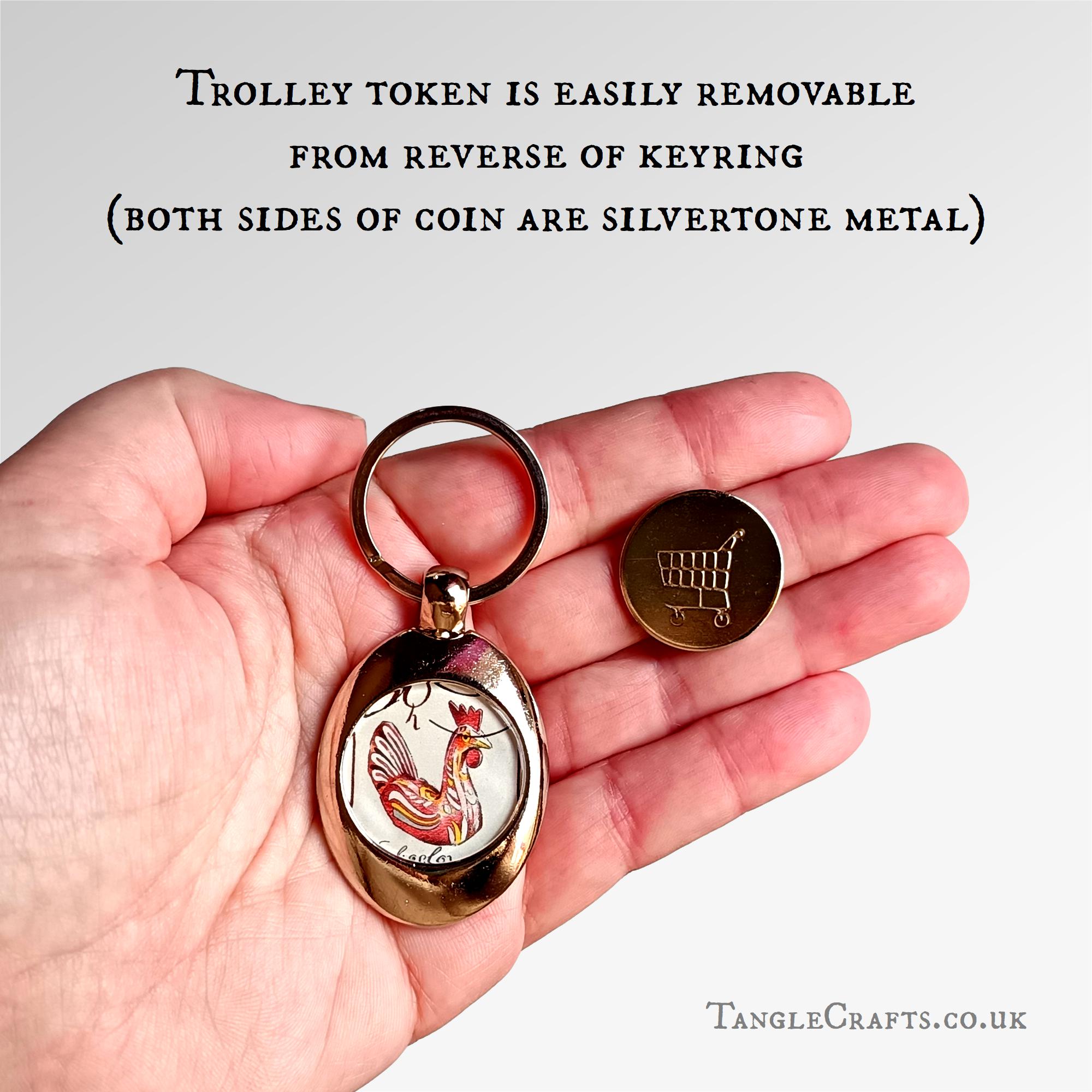 • The trolley coin is a solid metal disc measuring approx. 25mm diameter, silvertone on both sides. It is designed to fit both British & EU supermarket shopping trolley slots (if you are not in one of these regions, the token is unlikely to work but the keyring itself is still perfectly functional!)