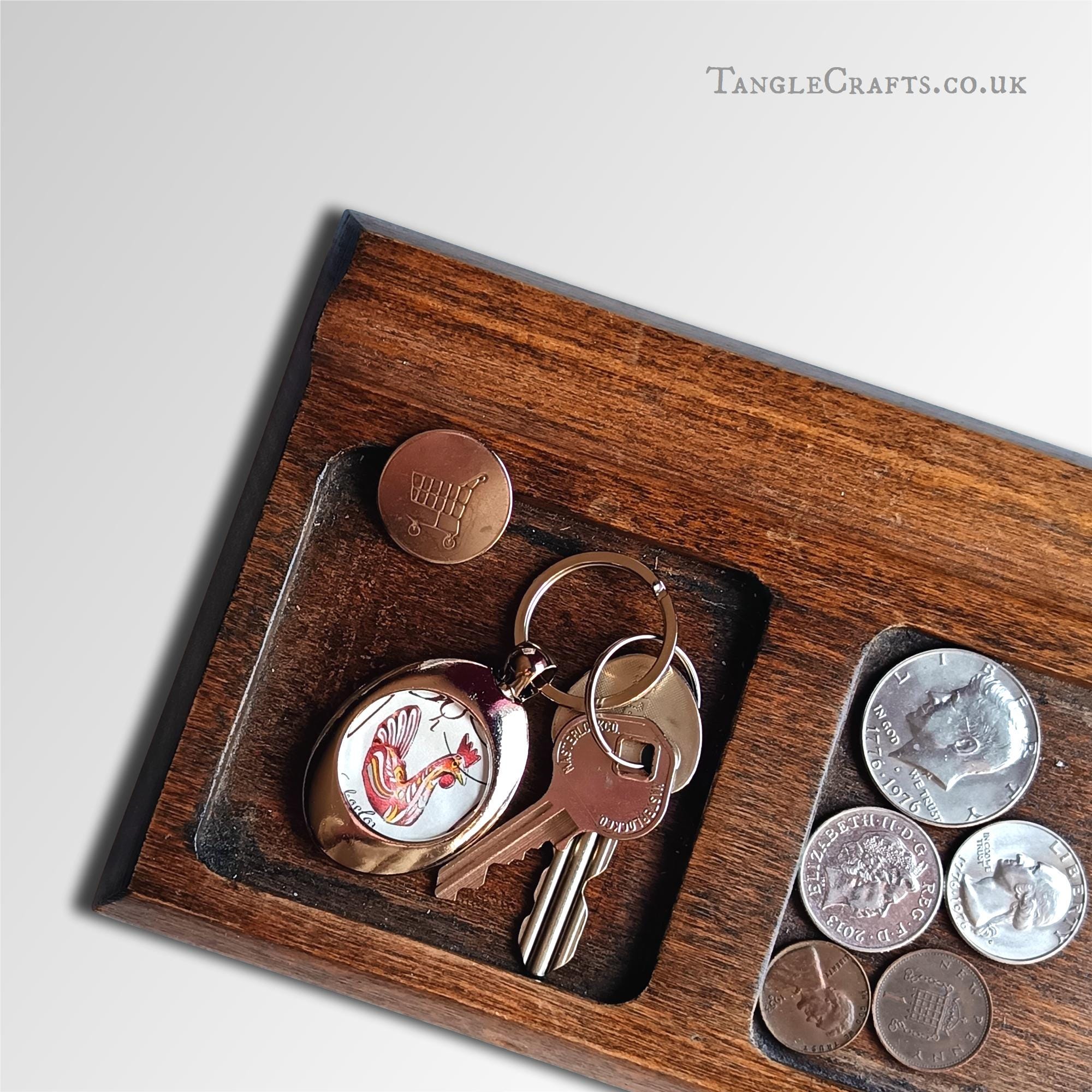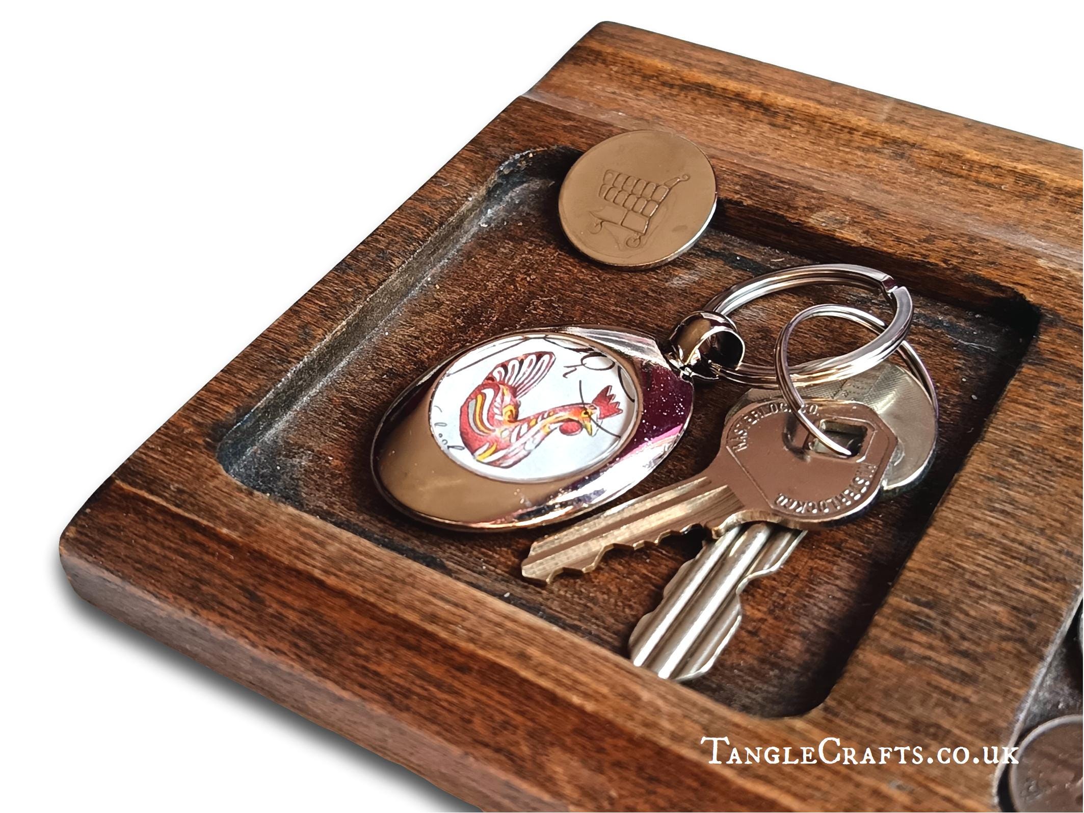 • The coin is set into the reverse of the keyring and lies flush.