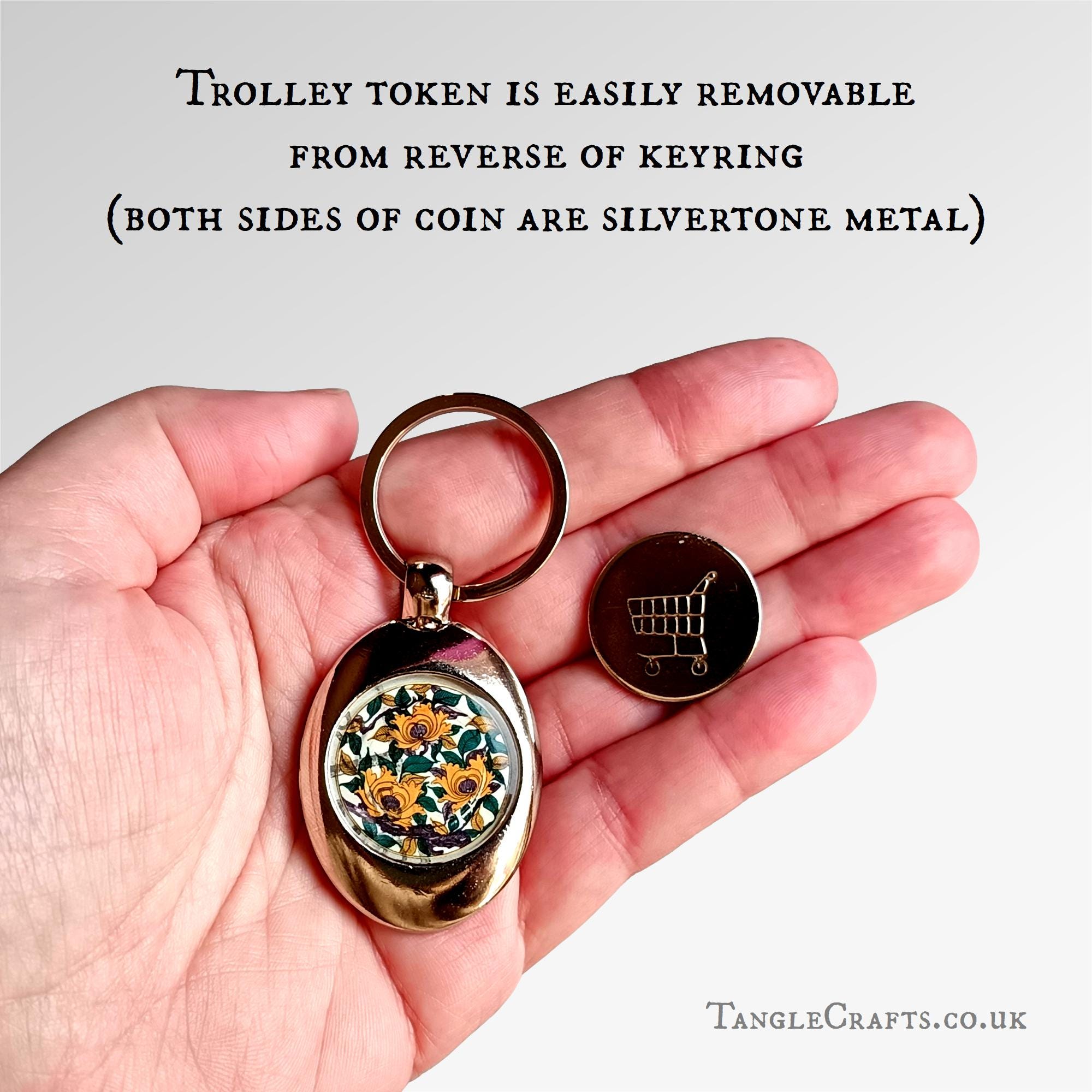 • The trolley coin is a solid metal disc measuring approx. 25mm diameter, silvertone metal on both sides. It is designed to fit both British & EU supermarket shopping trolley slots (if you are not in one of these regions, the token is unlikely to work but the keyring itself is still perfectly functional!)