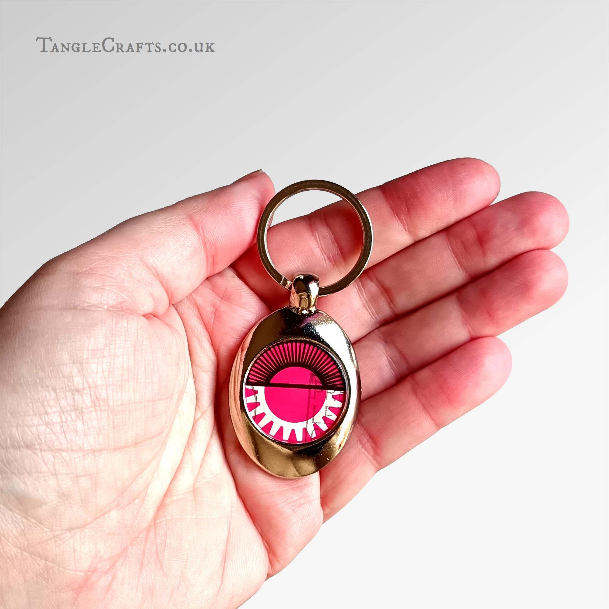 This striking, multifunctional keyring features a clever rising sun/cogwheel motif from a real vintage 60s postage stamp - the perfect gift for any design-loving philatelist. The sturdy metal keychain doubles up functionality with a handy trolley coin on the reverse, so it is twice as useful! Please read on for full details: