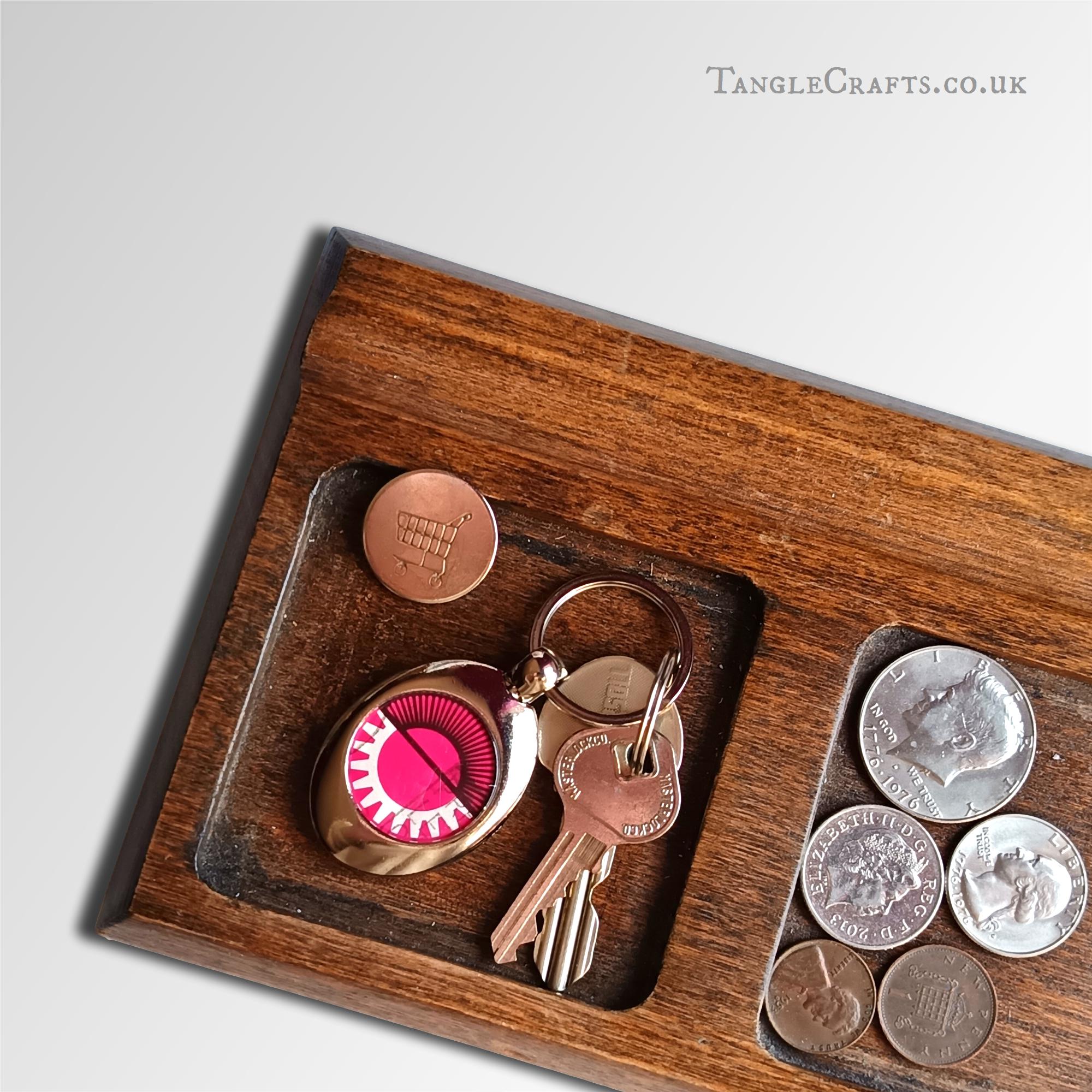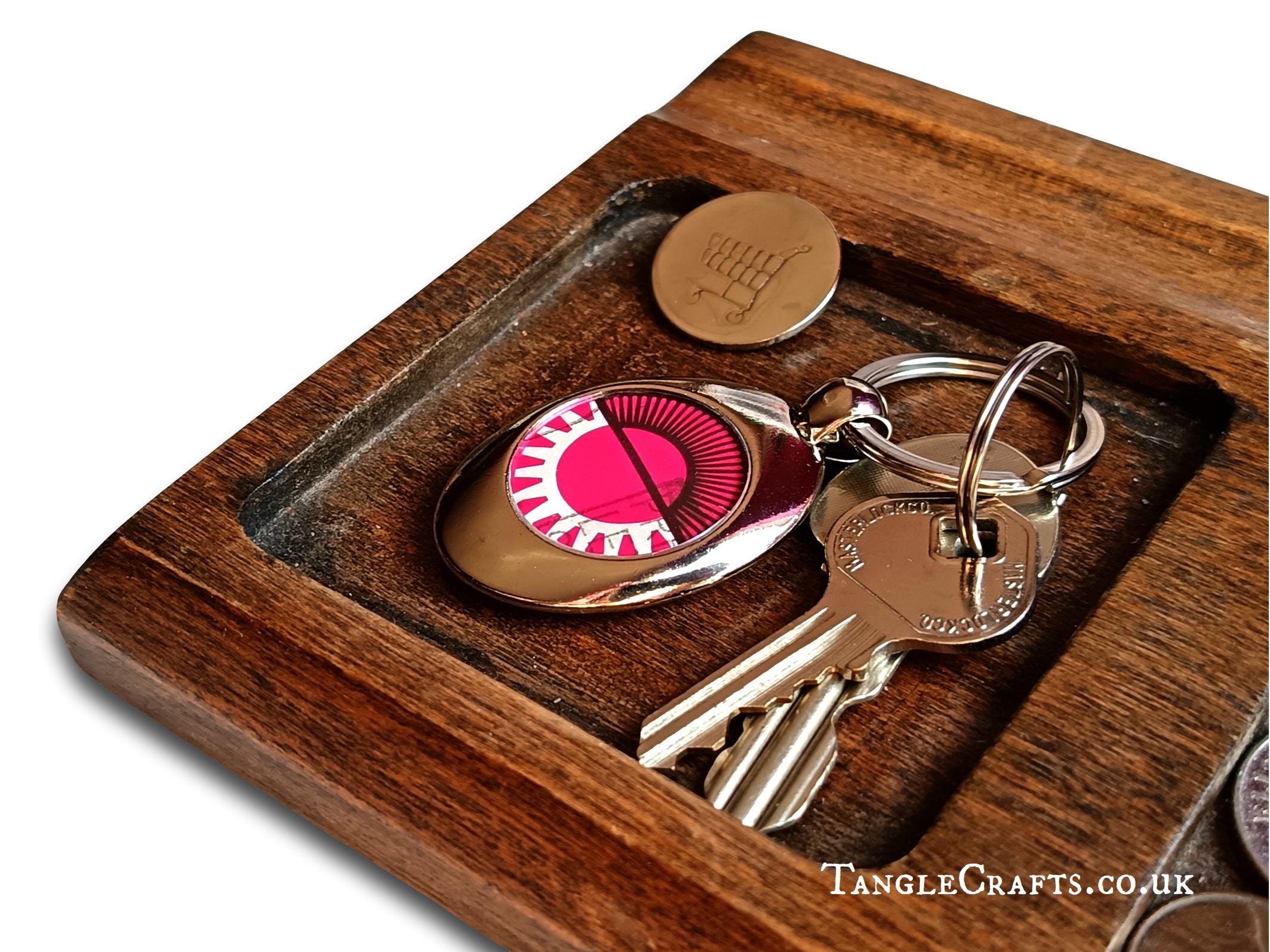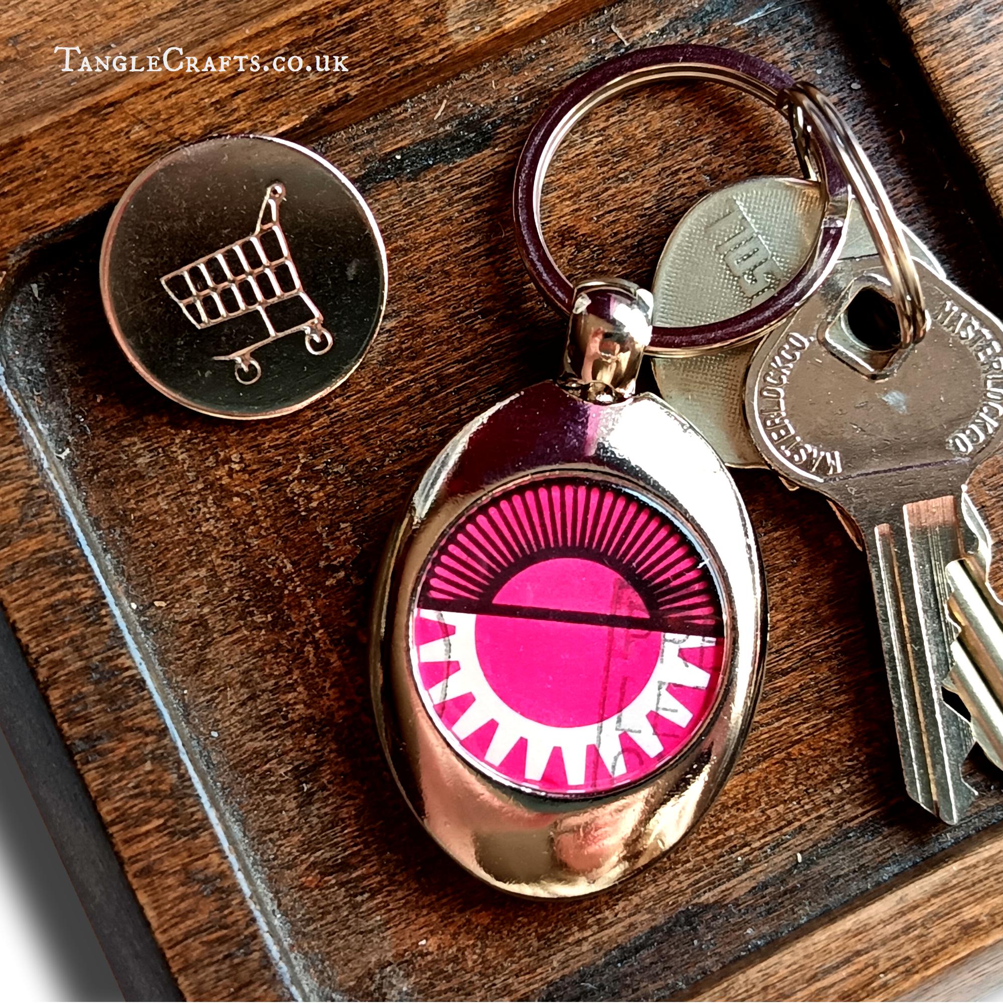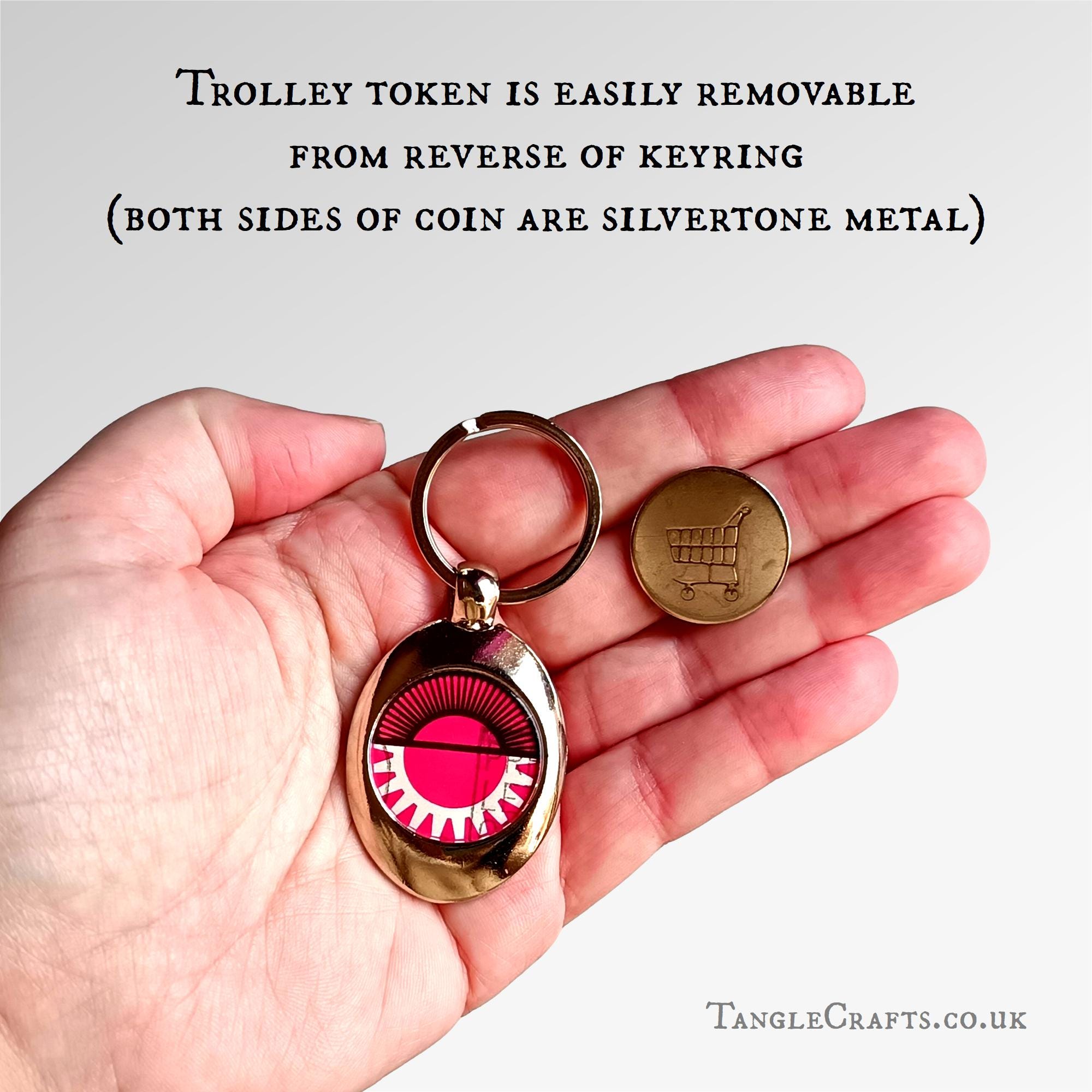 • The trolley coin is a solid metal disc measuring approx. 25mm diameter, silvertone on both sides. It is designed to fit both British & EU supermarket shopping trolley slots (if you are not in one of these regions, the token is unlikely to work but the keyring itself is still perfectly functional!)